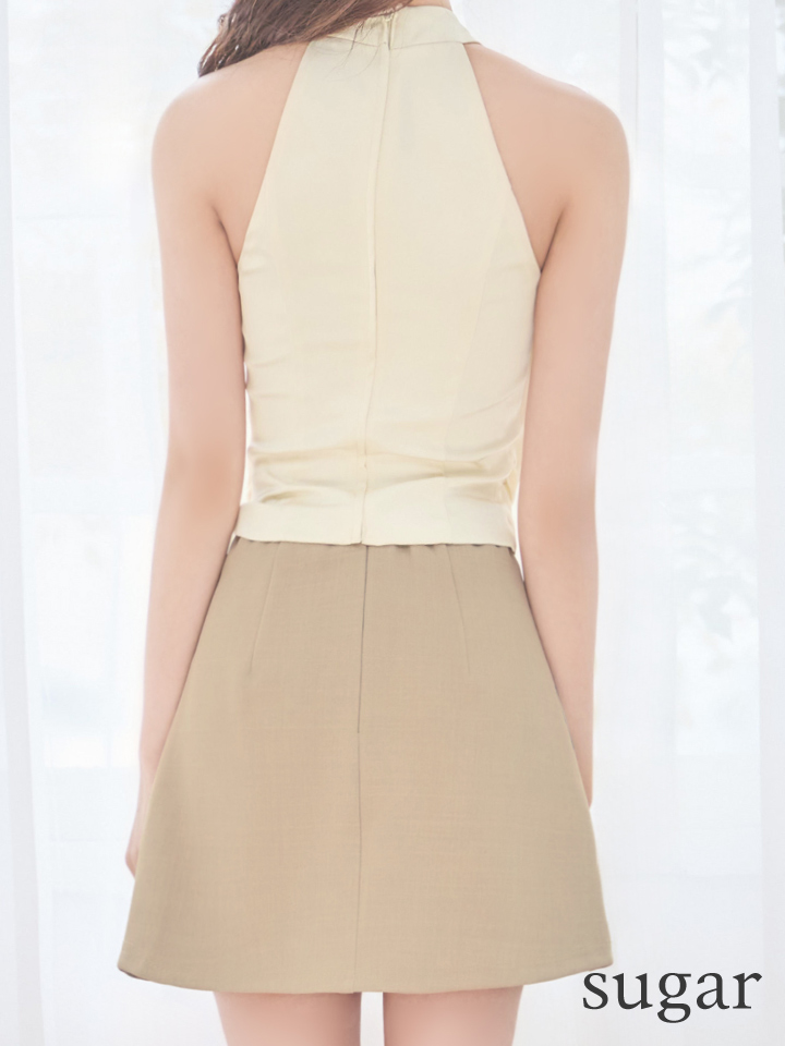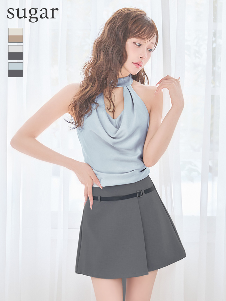 首元のホルターネックデザインと美しいドレープが印象的なトップスに、すっきりと広がるミニ丈ボトムを合わせた洗練セットアップ。