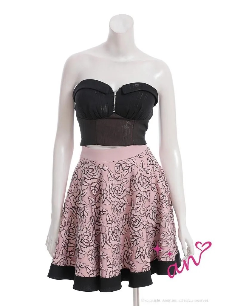 【an /アン】 ストラップ付/ セットアップ/ バストジップ/ ベア/ バイカラー/ フレア/ 花柄レース/ ミニドレス/ キャバドレス[OF05]