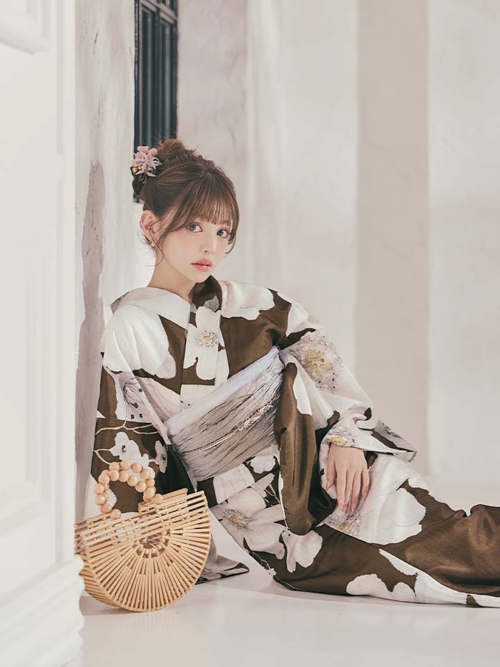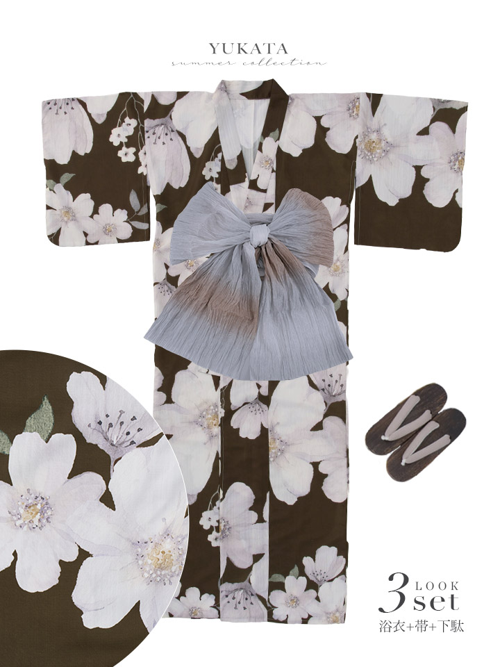 ブラウン地に白花が映える、甘さ控えめな大人モード浴衣