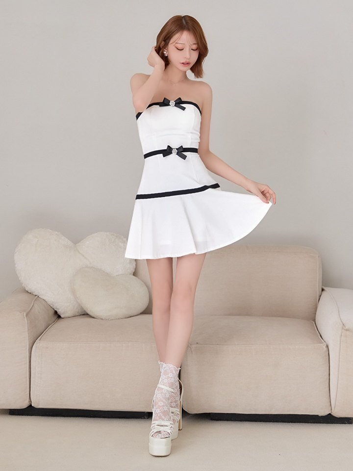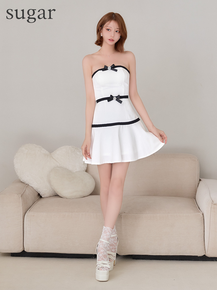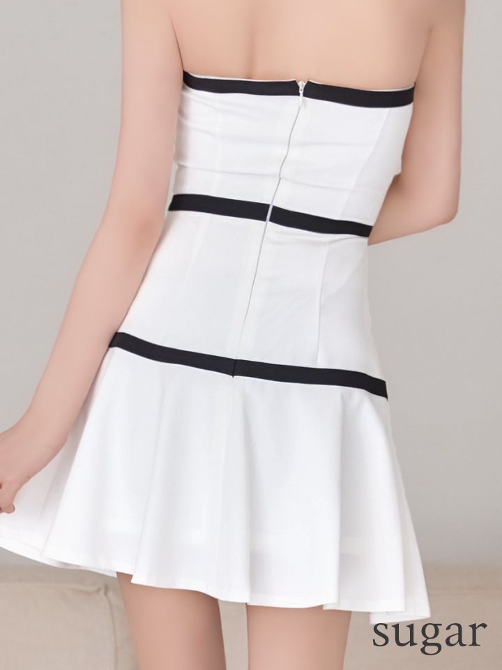 デコルテを大胆に魅せたベアデザインがセクシーなミニドレス。
