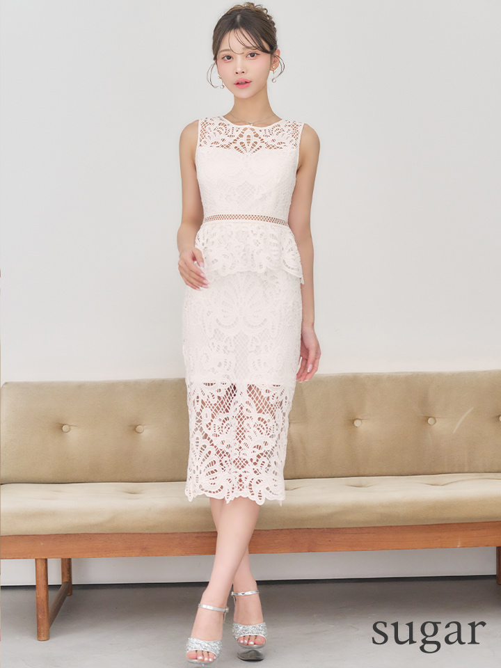 XS-Lサイズあり【SETTAN/セッタン】総レース/ ペプラム/ クラシカル柄/ 刺繍/ シースルー/ ノースリーブ/ タイト/ ミディアムドレス/ キャバドレス[OF2] [LKS25206-W-S2603]