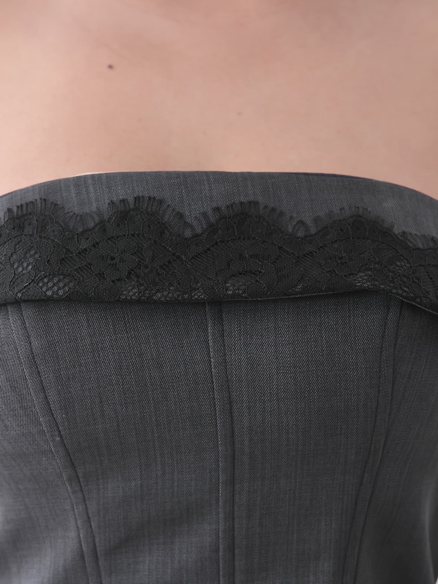 デコルテを美しく見せるベアトップデザインに、繊細なレースディテールをさりげなくあしらった上品で女性らしい一着。