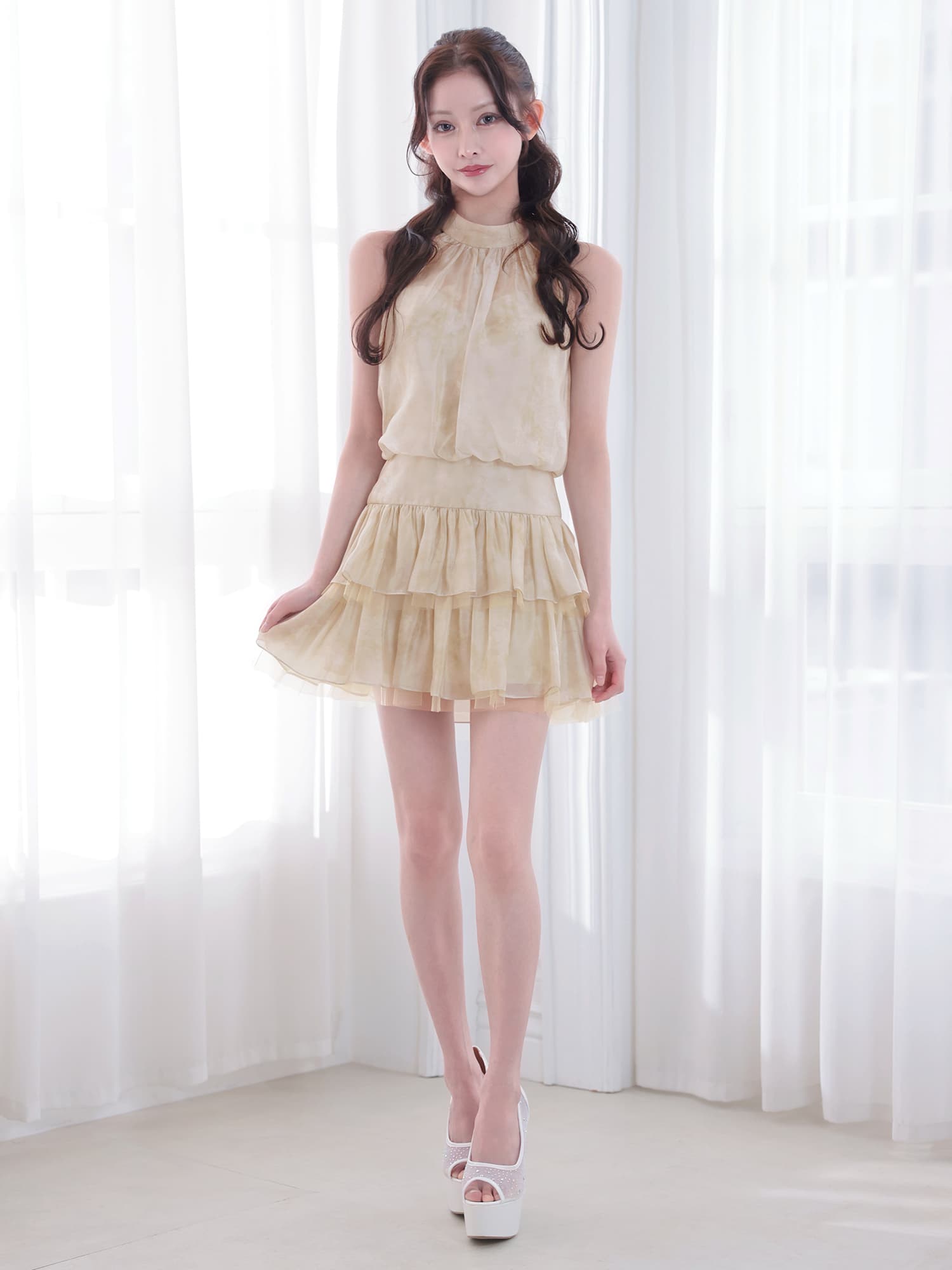 【予約商品/3月下旬-4月上旬発送予定】XSサイズあり【ANGEL R/エンジェルアール】ホルターネック/ ギャザー/ ウエストマーク/ フラワー/ シフォン/ フレア/ マイクロミニドレス/ キャバドレス[OF2] [AR26211-BE-S260309]