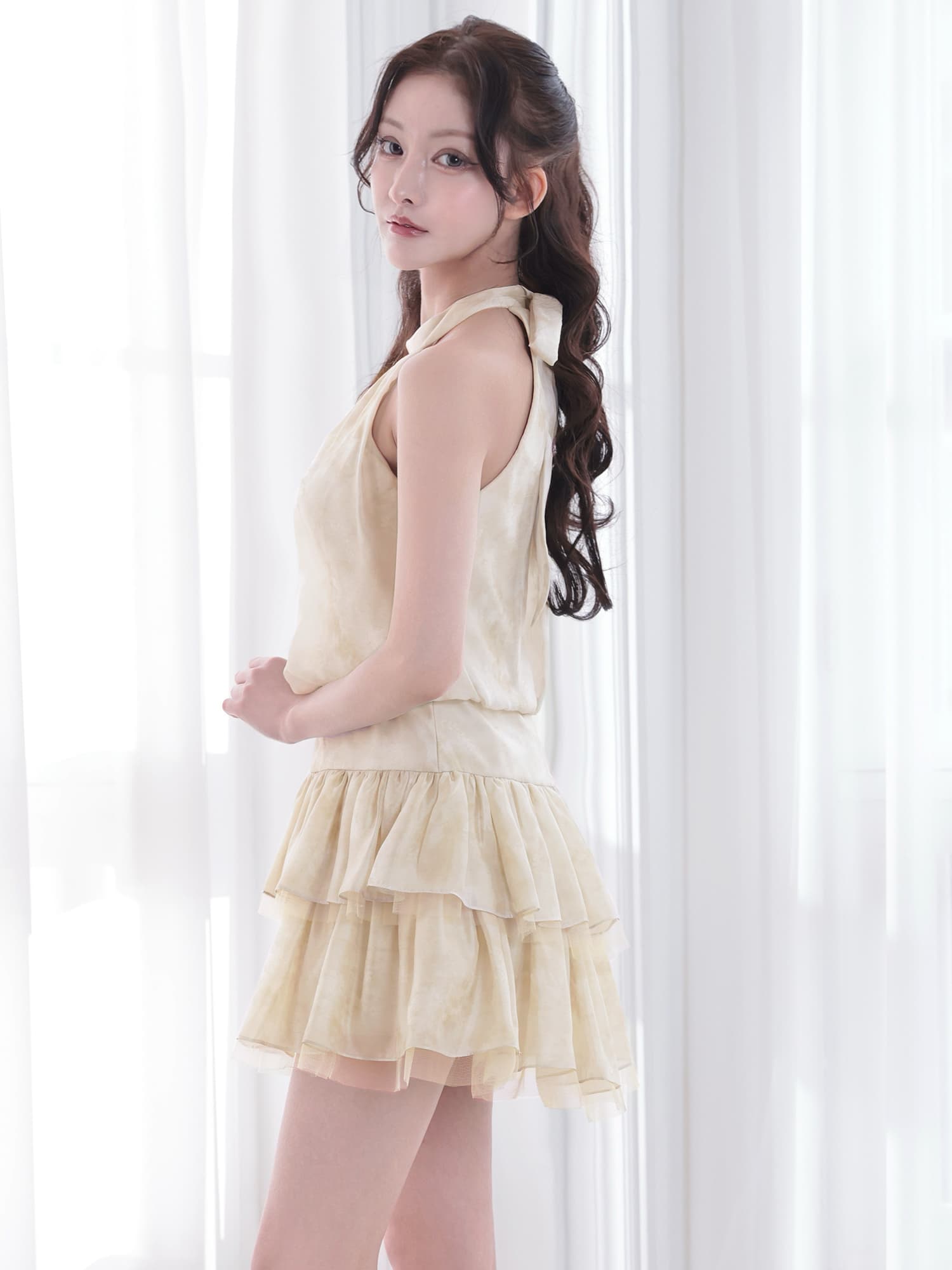 首元にギャザーをたっぷり施したホルターデザインが視線を集め、顔まわりを華やかに見せてくれる女性らしいシルエット。
