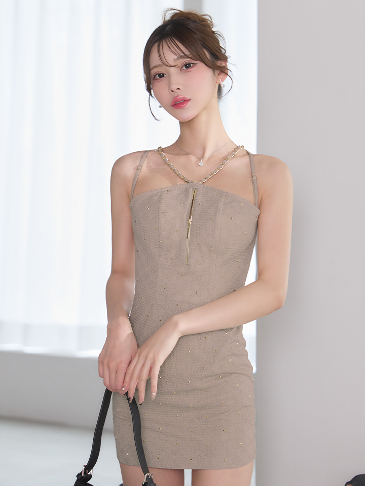 スタッズとチェーンが強めの女性を演出するミニワンピ。