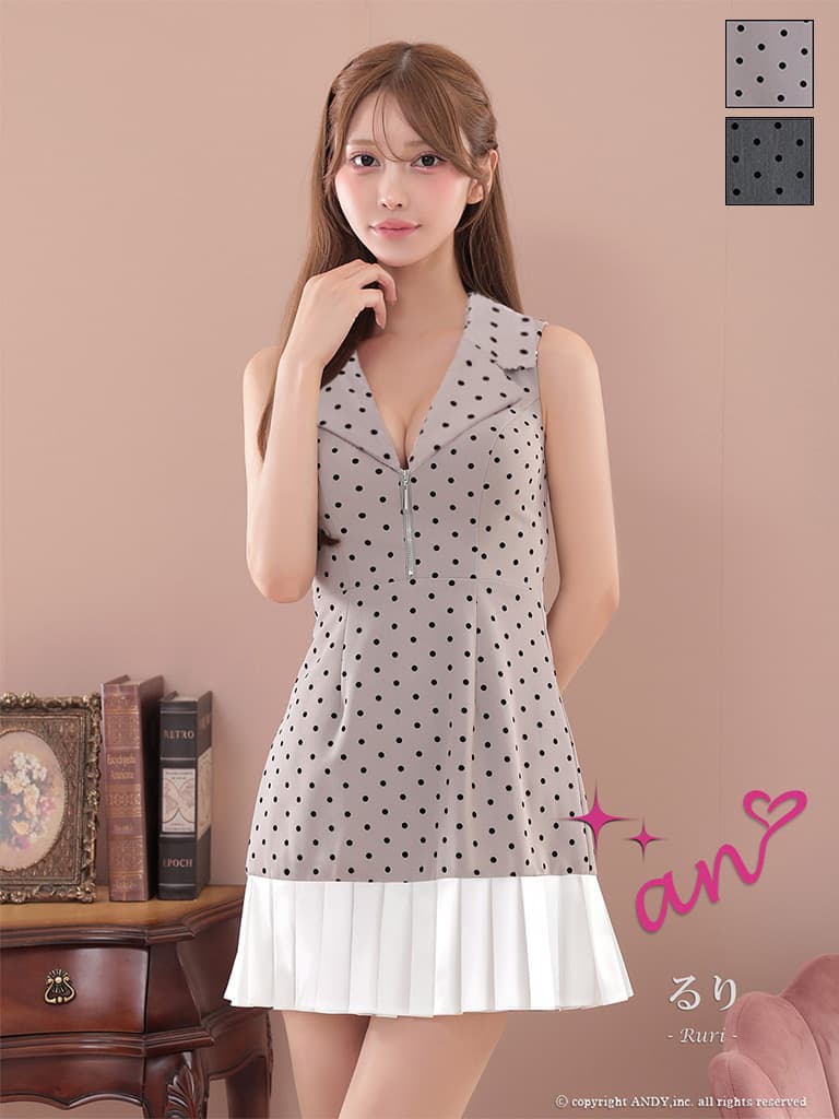 - > XSサイズあり【an/アン】襟付き/ Vネック/ ノースリーブ/ プリーツ/ ドット柄/ Aライン/ フレア/ ミニドレス/ キャバドレス[OF05]