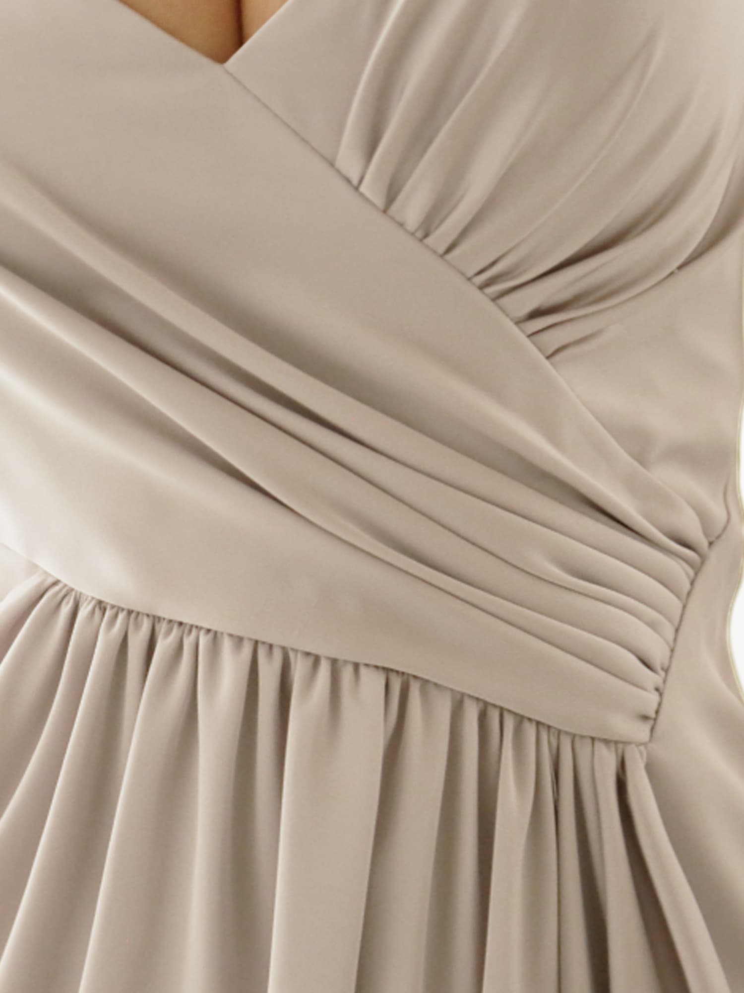 上品な光沢を放つドレープサテンを使用し、斜めに入ったタックデザインが立体感のあるシルエットを演出。