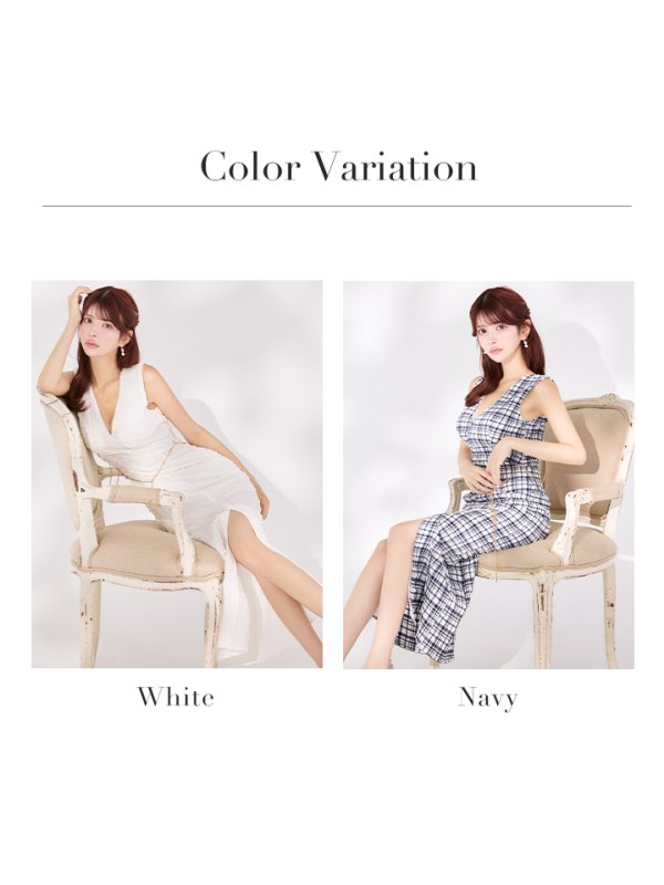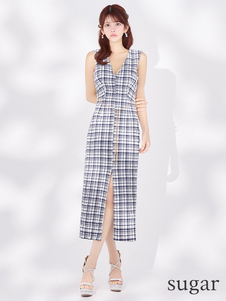 - > 【VELIQUE/ヴェリーク】チェーン付き/ バックオープン/ ノースリーブ/ Vネック/ センタースリット/ ポップコーン生地/ ストレッチ/ タイト/ ミディアムドレス/ キャバドレス【HC02】