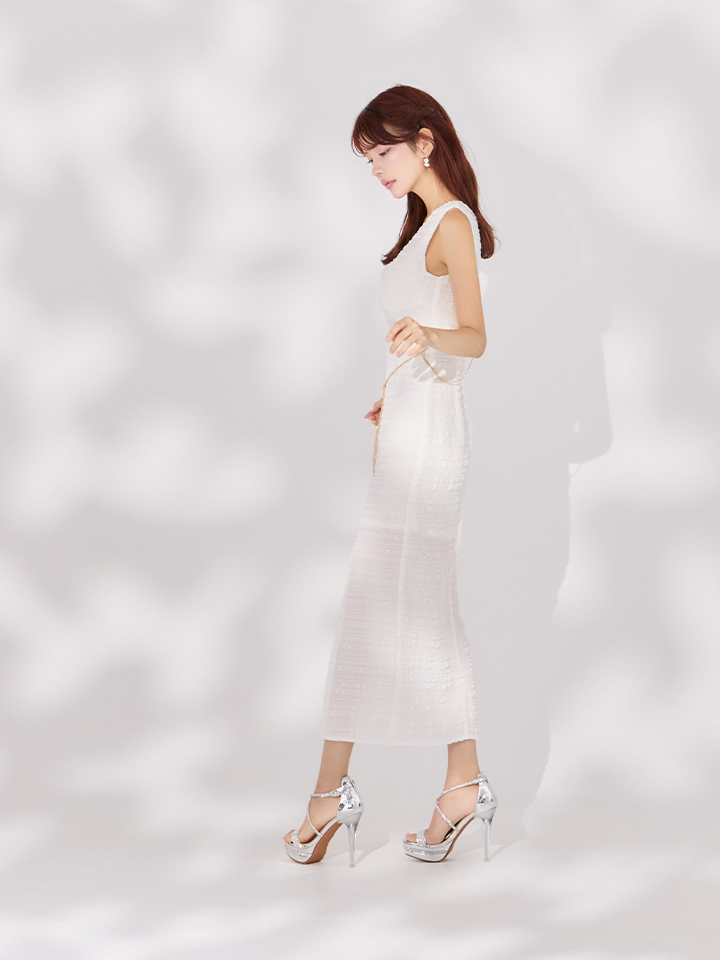 爽やかで立体感のある生地が清楚レディな印象を与えるミディアムドレス。