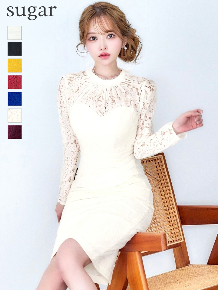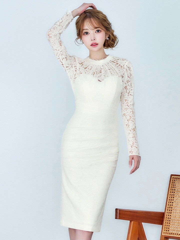 - > Lサイズあり【VANESSA HEART / ヴァネッサハート】【OF05】総レース/ ハイネック/ ロングスリーブ/ 袖あり/ タック/ 膝丈/ タイト/ ミディアムドレス/ キャバドレス