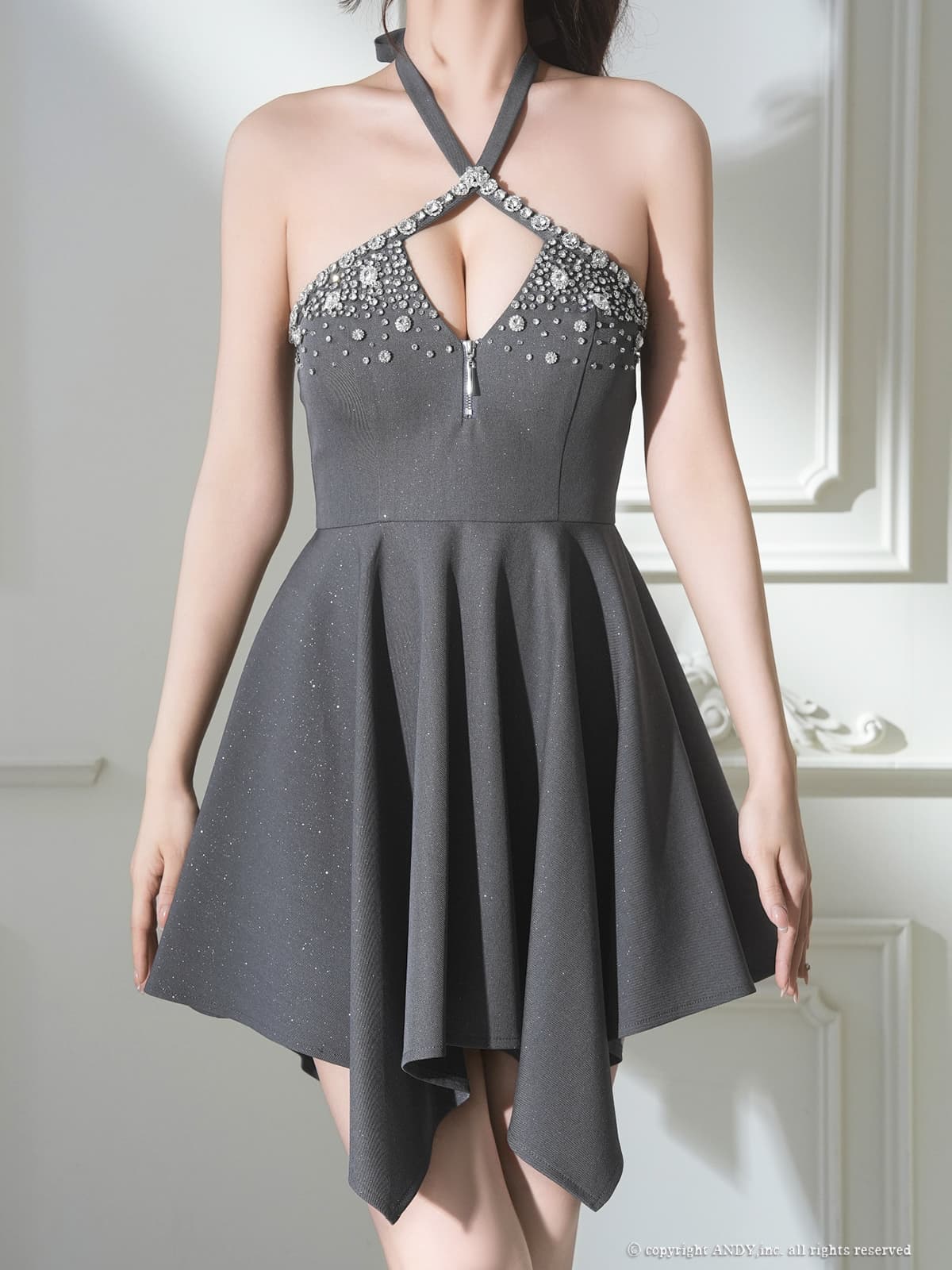 XSサイズあり【an/アン】ホルターネック/ バストカットアウト/ノースリーブ/ ビジュー/ イレヘムスカート/ フレア/ ミニドレス/ キャバドレス[OF05] [AOC4037-GY-2603]