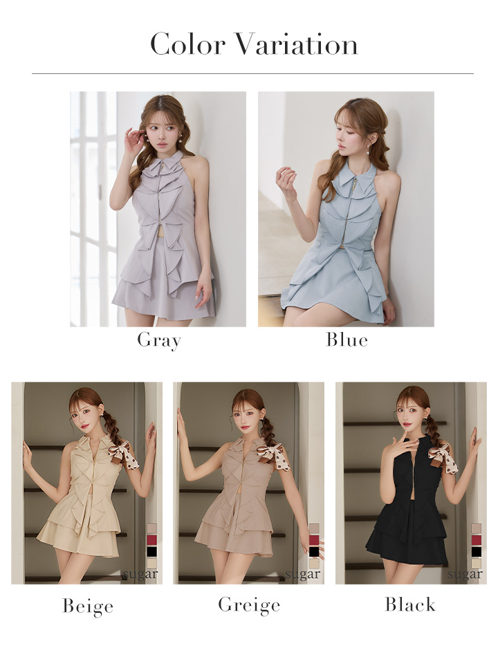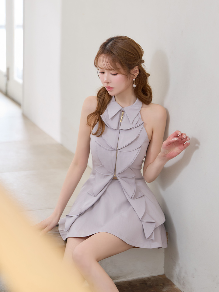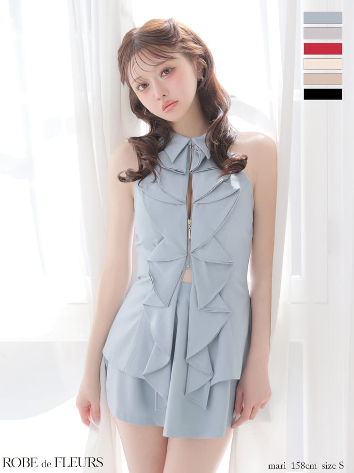 XSサイズあり【ROBE de FLEURS/ローブドフルール】フロントラッフル/ ホルター/ フレア/ セットアップ/ ミニドレス/ キャバドレス[OF08]【一部予約商品/3月下旬発送予定】 [FM3468-GY-S260319]