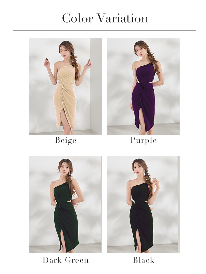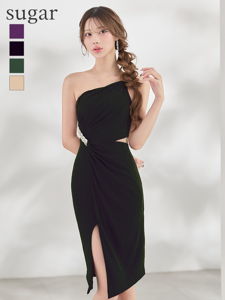- > XSサイズあり【Veautt/ヴュート】ワンショルダー/ ビジュー/ ウエストカット/ タック/ スリット/ タイト/ ミディアムドレス/ キャバドレス【OF05】
