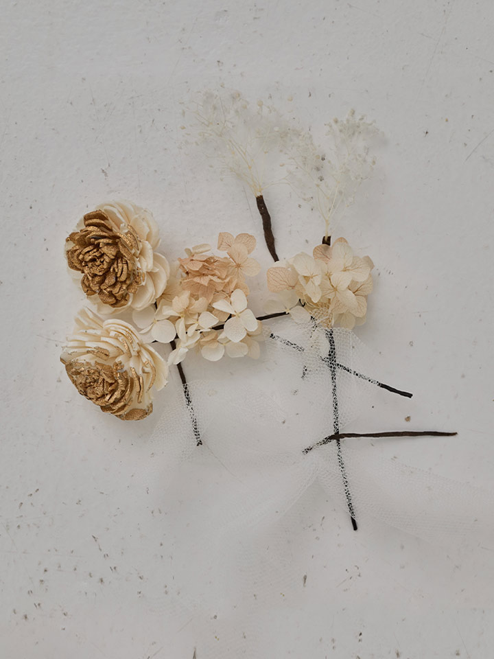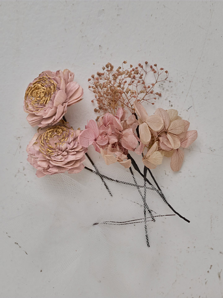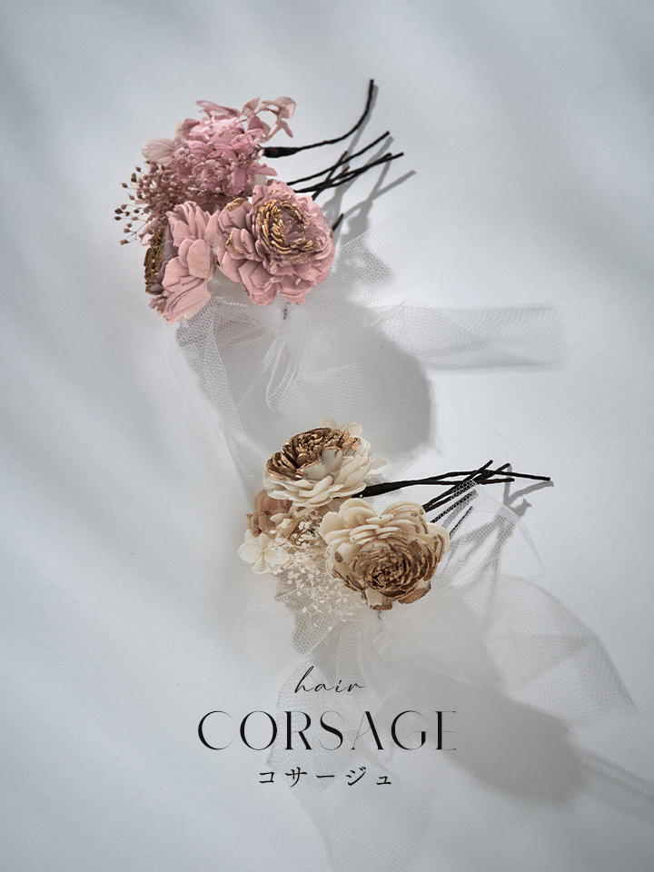 柔らかな色合いが魅力のくすみカラーでまとめたコサージュセット。