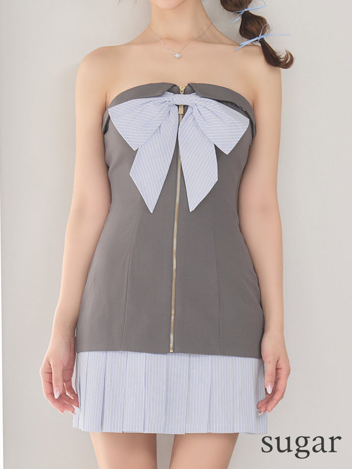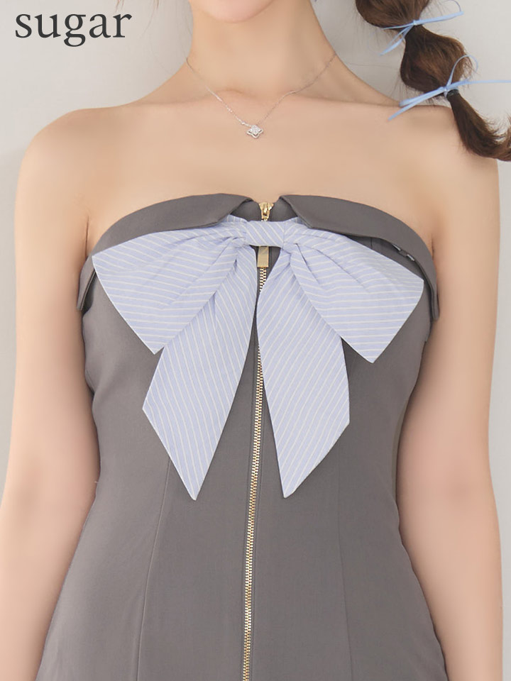 【きこ/関西コレクション着用】XSサイズあり【ANIER./アニエル】【ROBE de FLEURS/ローブドフルール】springstripe ribbon bare mini dress/ リボン/ バイカラー/ ベア/ フレア/ ミニドレス/ キャバドレス[OF08] [ANIER4067-GY-S260410CC]