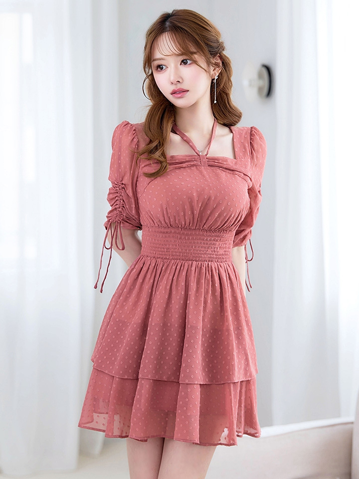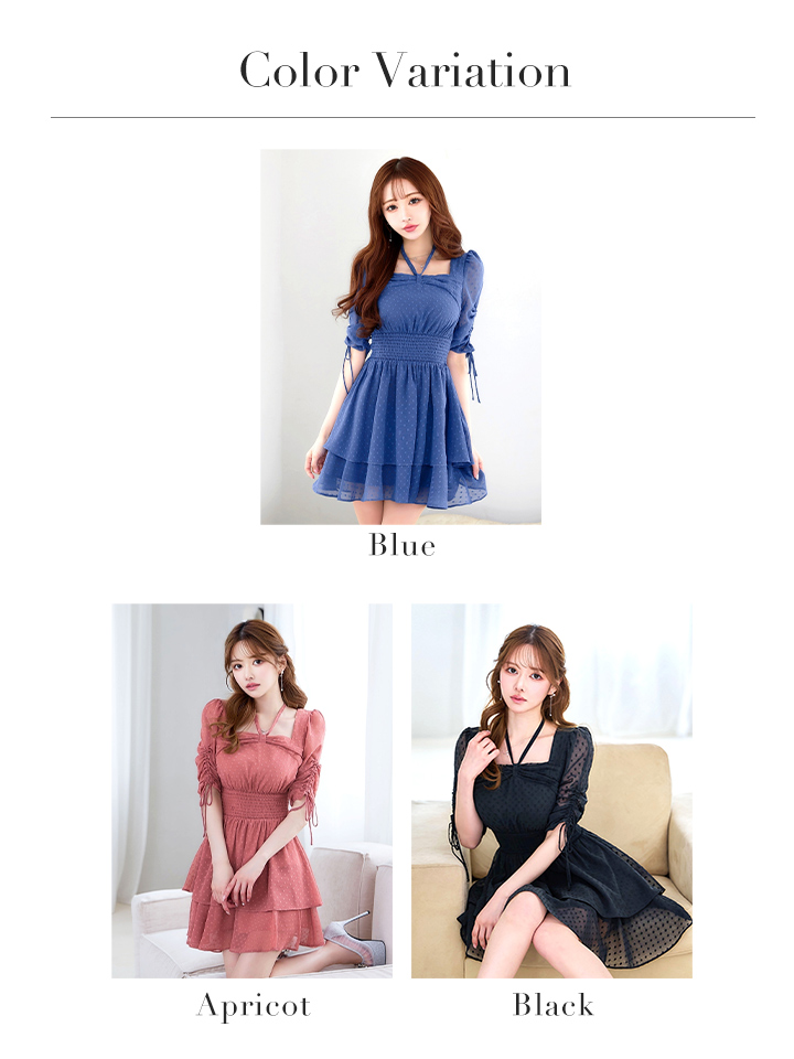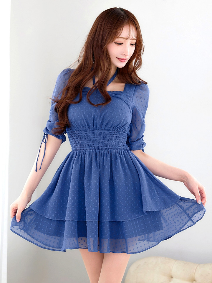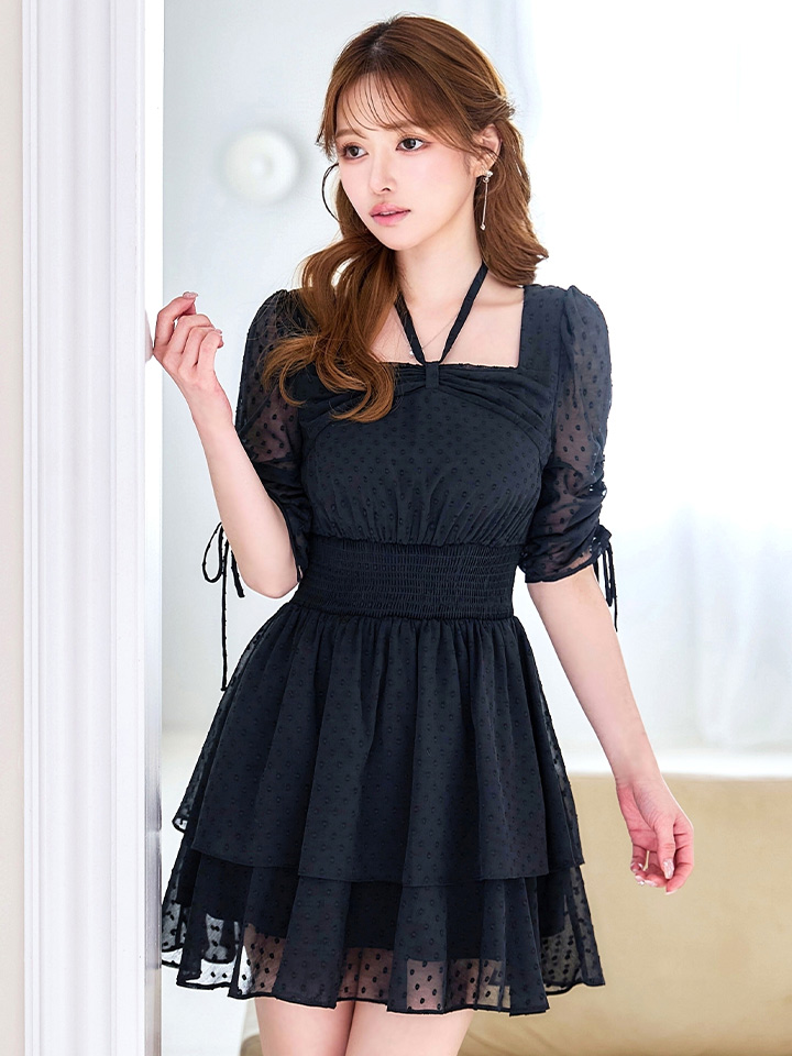 ドットシアーを重ねた軽やかな素材感が大人可愛いフレアミニドレス。