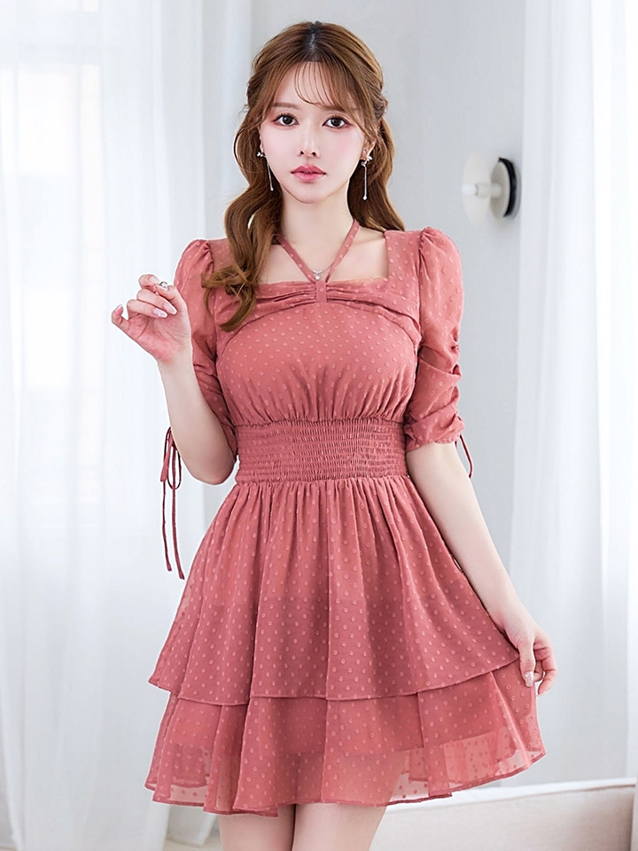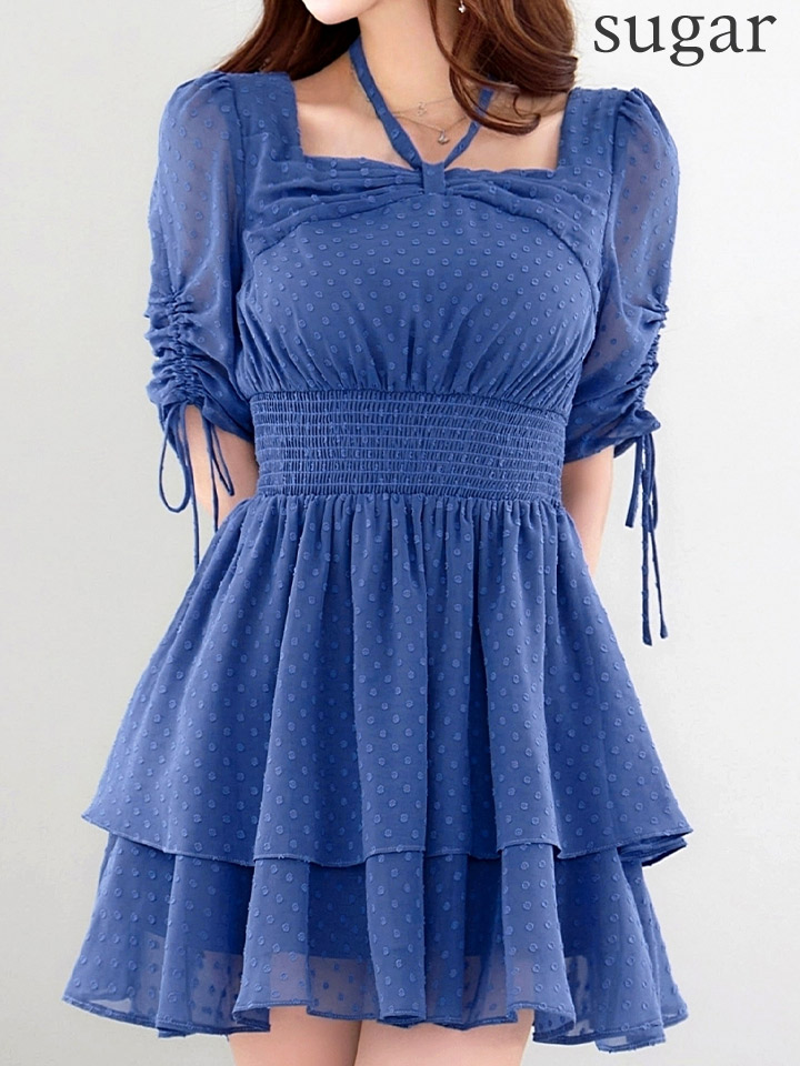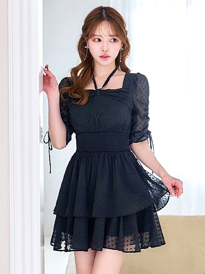 - > XS-Lサイズあり【Donia Quinn / ドニアクイーン】 ドット/ 袖付き/ シャーリング/ 2段フリル/ スクエアネック/ ティアード/ ウエストマーク/ ストレッチ/ フレア/ ミニドレス/ キャバドレス[OF05]