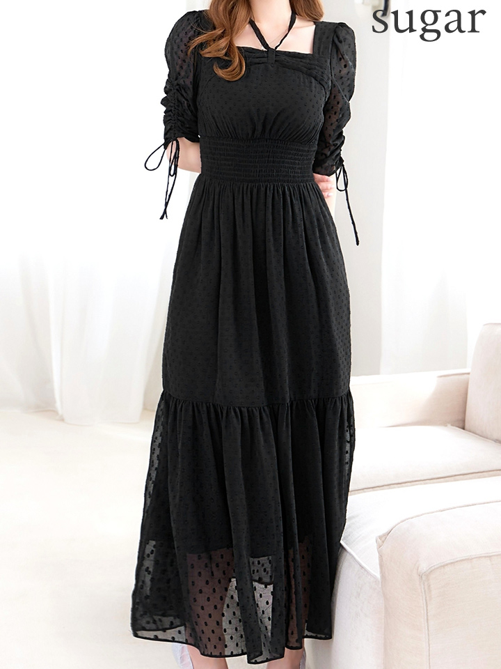 XLサイズあり【AMORA GRACE / アモーラグレース】 オケージョンドレス/ パーティードレス/ お呼ばれドレス/ ドット/ ハーフスリーブ/ ドロスト/ ギャザー/ フレア/ ミモレ丈/ ワンピース/ ミディアムドレス/ キャバドレス[OF05]