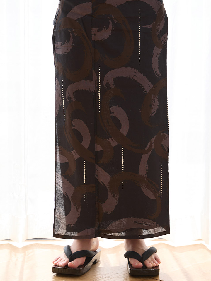 暗めの配色が全体を引き締め、ゆったりとした柄行きが