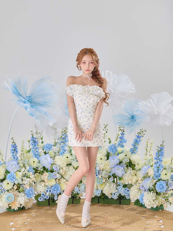 XSサイズあり【ROBE de FLEURS/ローブドフルール】ラメ/ フラワー/ ギャザー/ シフォン/ フリル/ ワンショル/ ベア/ 2way/ タイト/ ミニドレス/ キャバドレス[OF08]