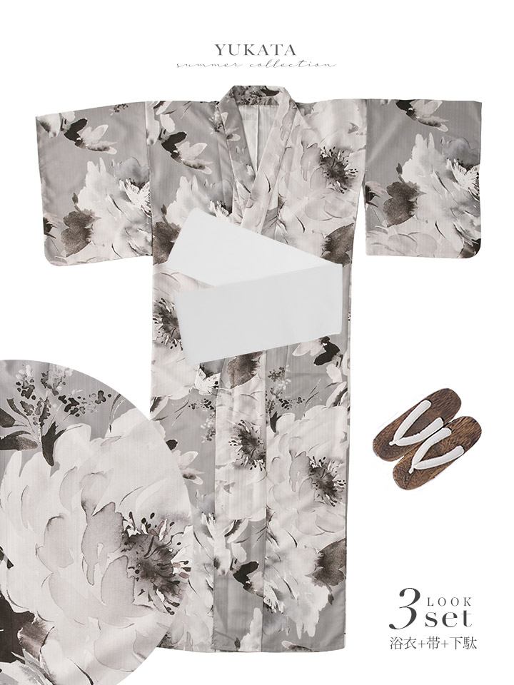 送料無料!グレイッシュフラワー浴衣【浴衣3点セット 浴衣/帯/下駄】[OF04]【予約 / 4月上旬発送予定】 [Y-9362-nz-dzm-GY-F-26YI-260404]