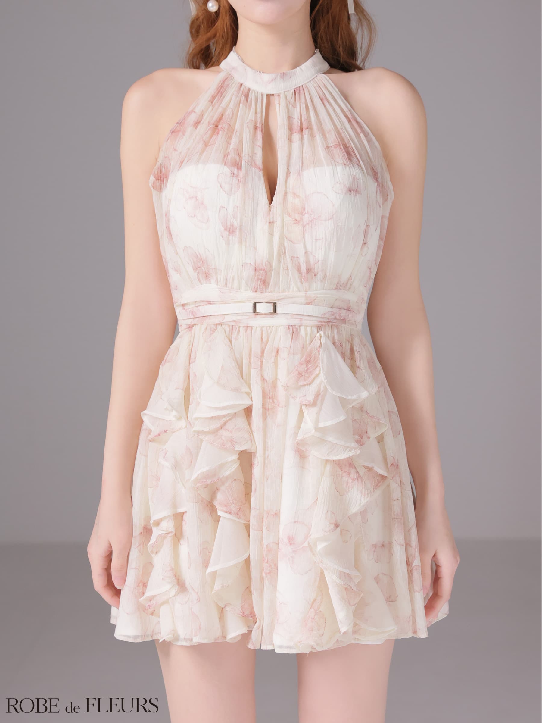XSサイズあり【ROBE de FLEURS/ローブドフルール】フラワー/ シフォン/ ホルター/ フレア/ ミニドレス/ キャバドレス[OF08] [FM3498-GR-2604]