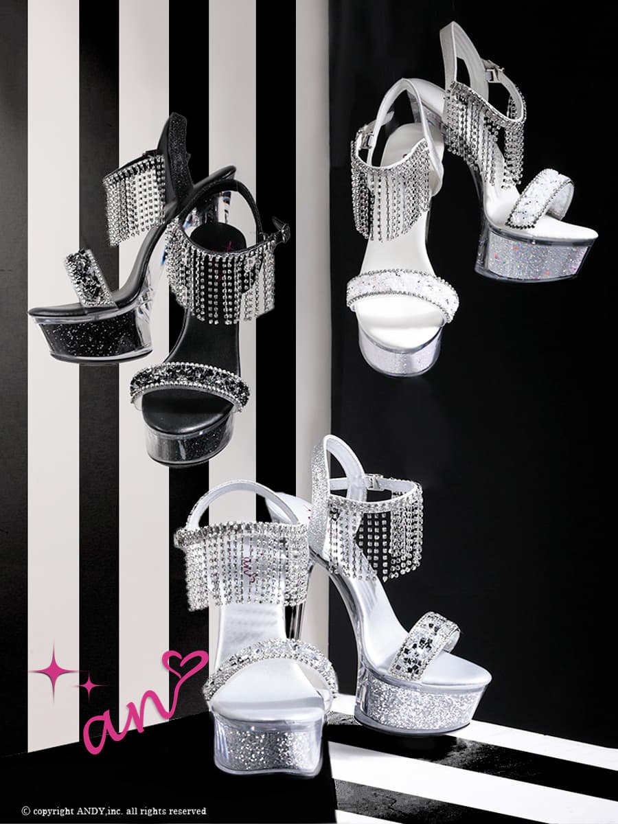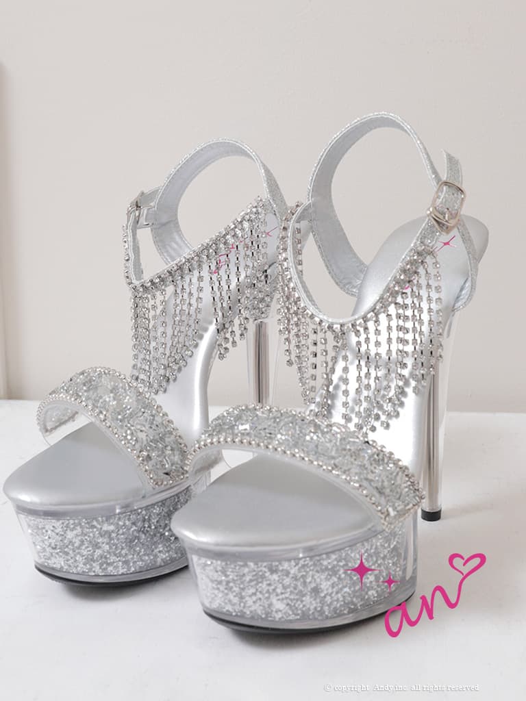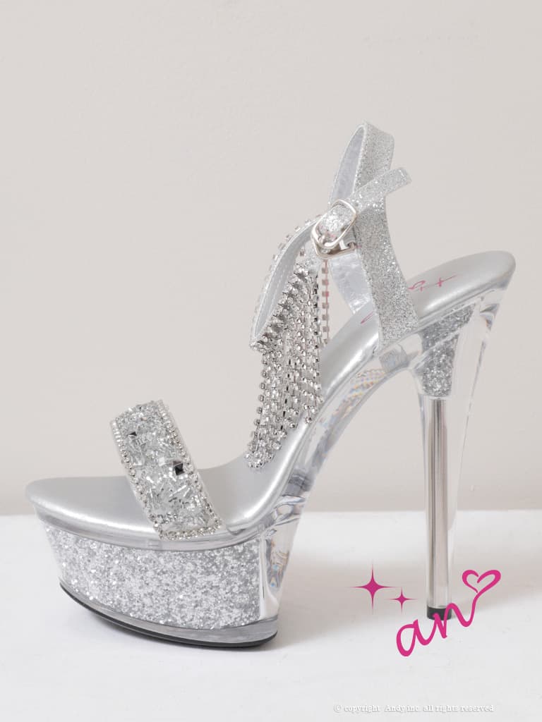【an】2color/ 15cmヒール/ ラインストーン/ ビジューチェーン/ グリッター/ アンクレット/ ハイヒール/ クリアヒール/ サンダル [OF02] [AOC-SH049-SV-2604]