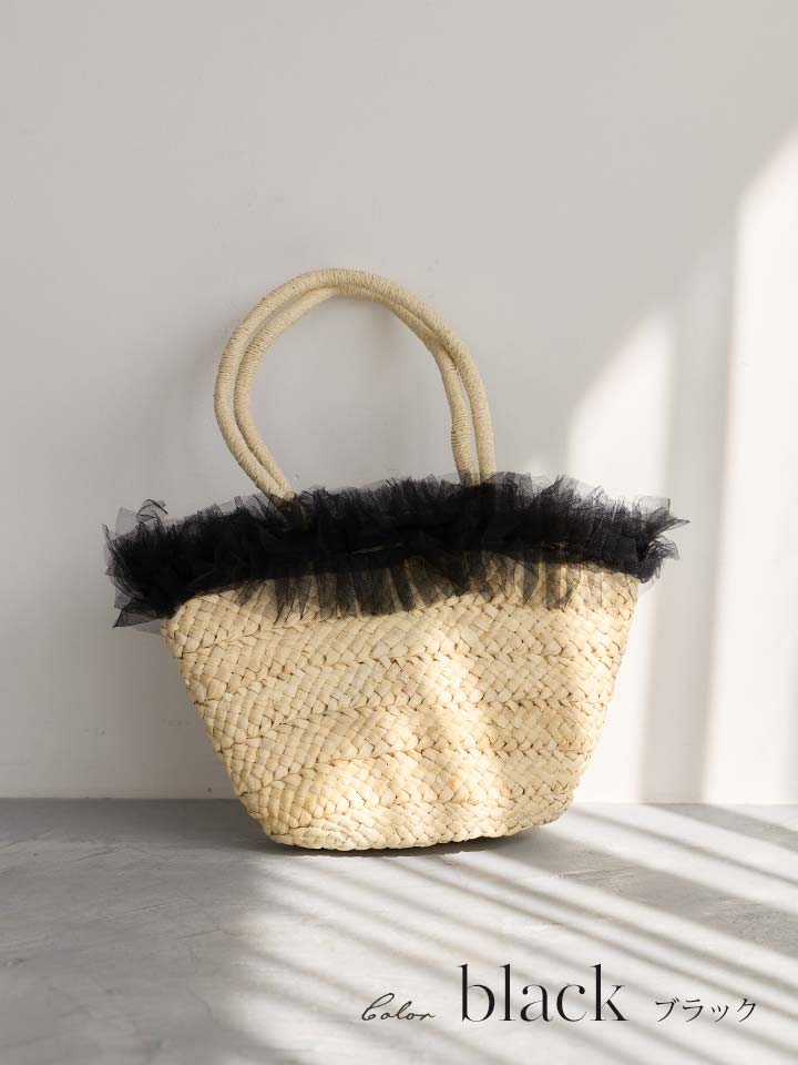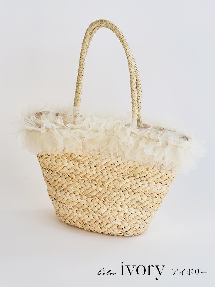 ナチュラルなカゴ素材にやわらかなチュールフリルが可愛らしいバッグ。