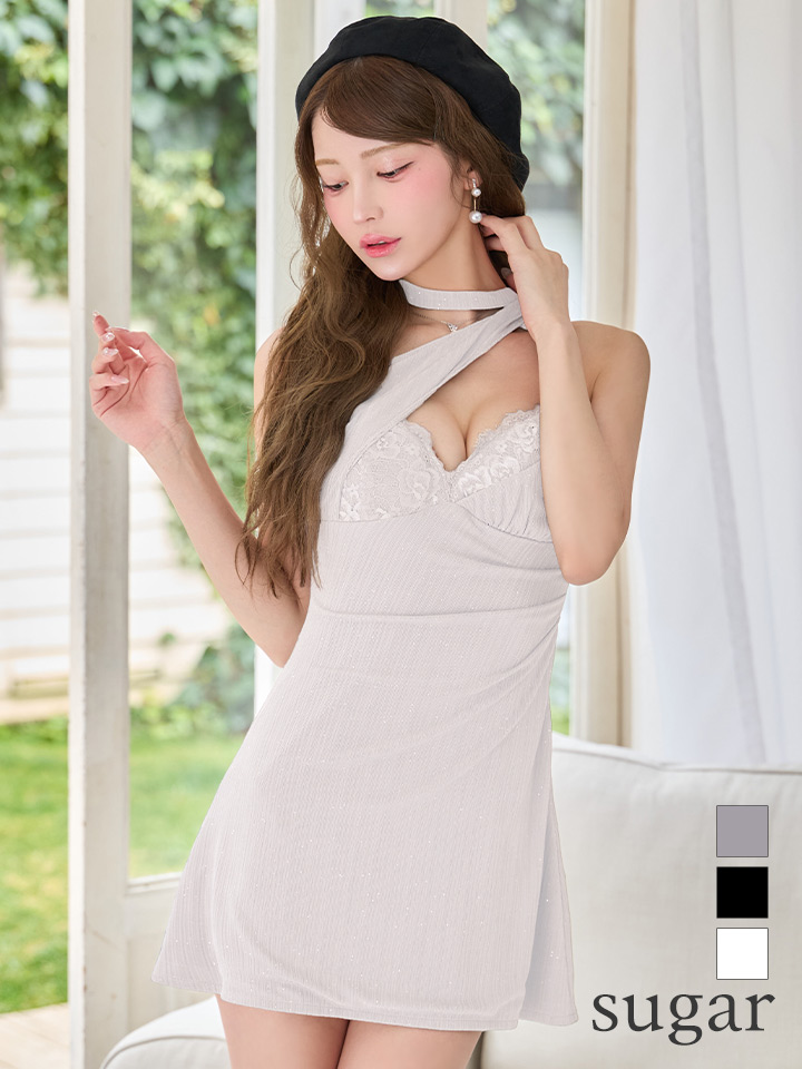 - > 【予約商品/4月中旬発送予定】XSサイズあり【Glossy/グロッシー】ラメニット/ レース/ ホルター/ ミニドレス/ キャバドレス[OF08]