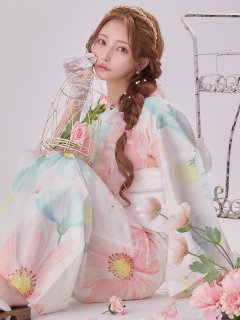 【コラボ浴衣】藍水彩フラワー浴衣/スウィート水彩ピンクコスモス浴衣【浴衣3点セット 浴衣/帯/下駄】【予約 / 4月下旬発送予定】