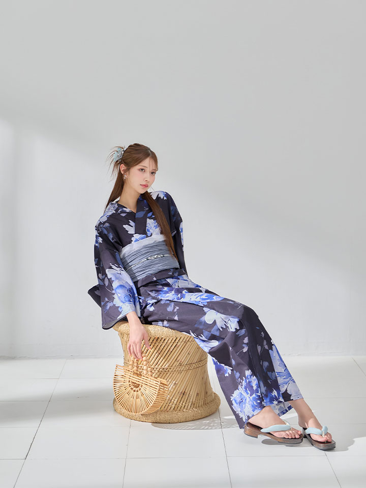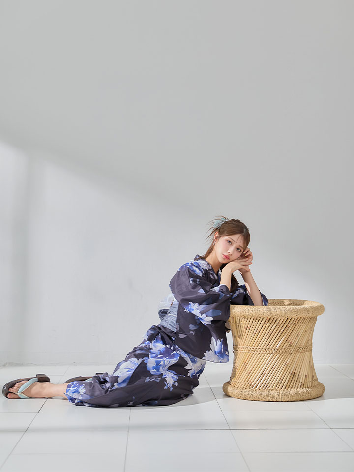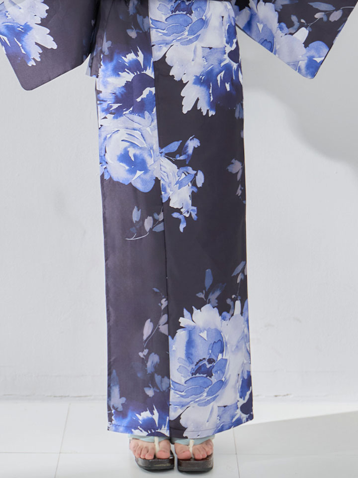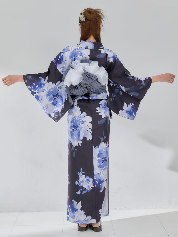ネイビー地に映える牡丹の柄が美しい浴衣