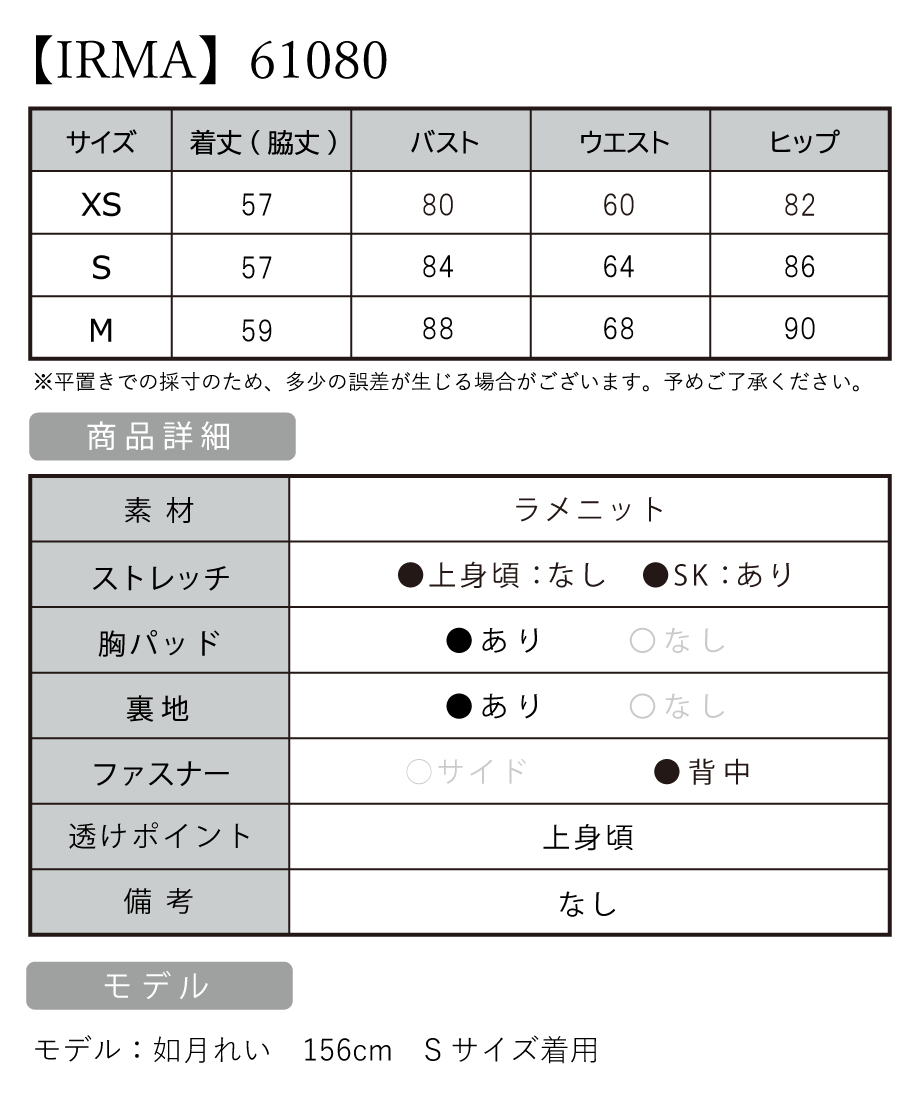 B:80 / W:60 / H:82 [着丈](脇下)約57cm |