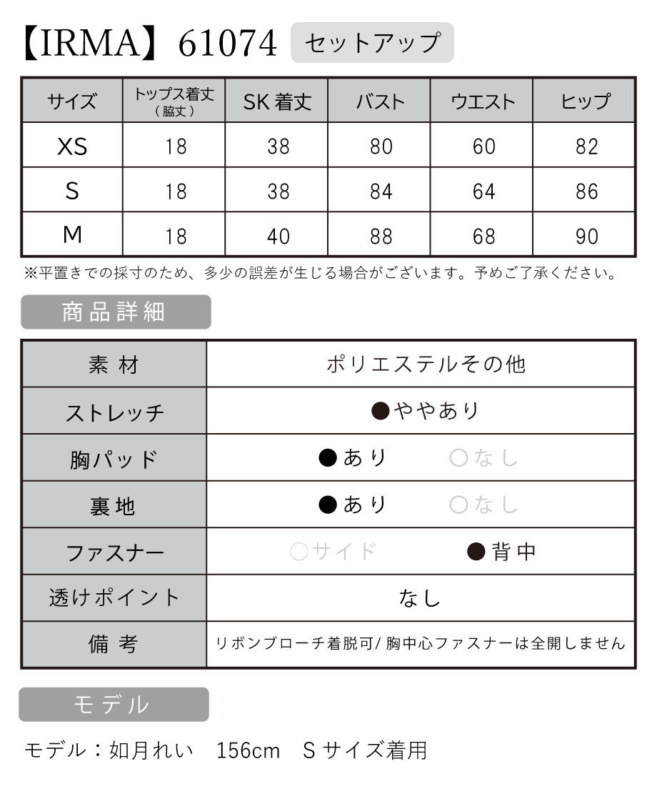 B:84 / W:64 / H:86 [着丈] トップス(脇丈):約18cm スカート:約38cm |