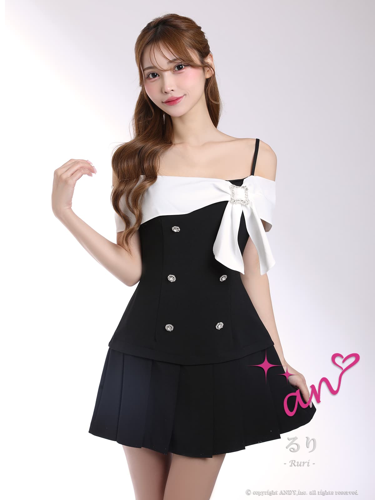 - > XSサイズあり【an/アン】ビジューバックル/ オフショルダー/ キャミソール/ プリーツ/ バイカラー/ ダブルボタン/ リボン/ フレア/ セットアップ風/ ミニドレス/ キャバドレス[OF05]