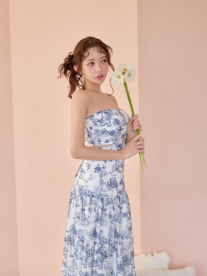 XSサイズあり【ANDY/アンディ】ベアトップ/ ウエストカット/ ノースリーブ/ 総柄/ リボン/ Aライン/ フレア/ ワンピース/ ロングドレス/ キャバドレス[OF05]