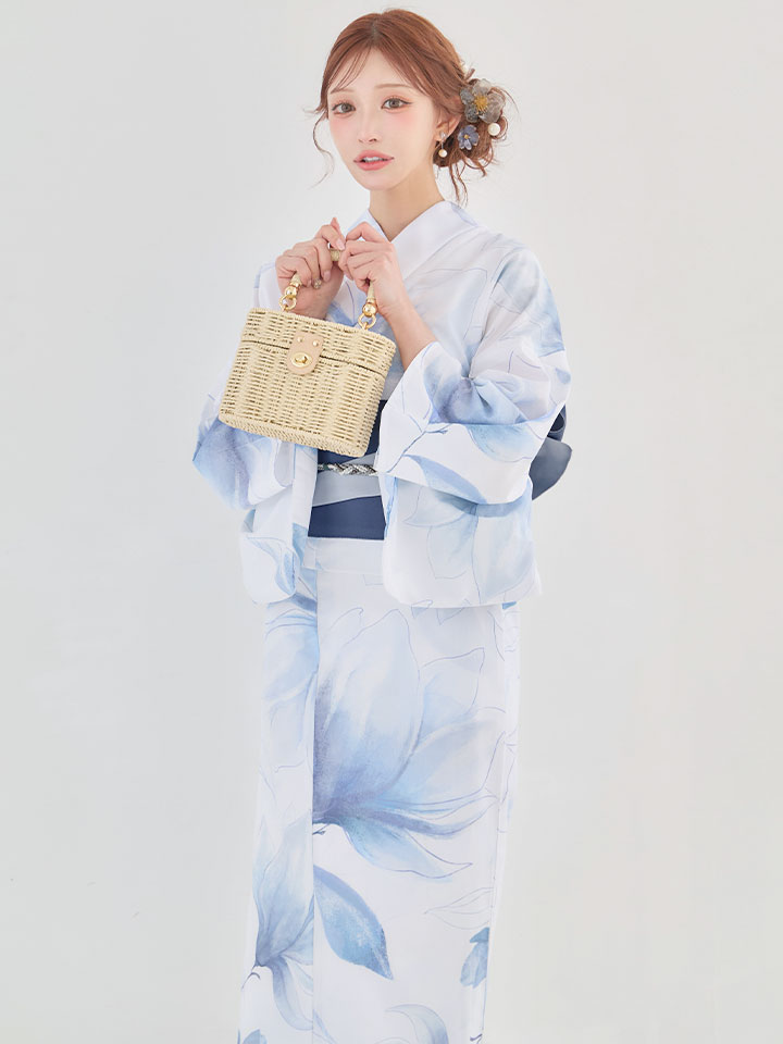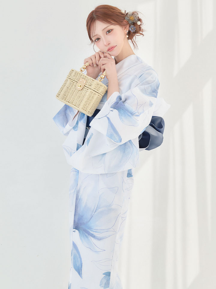 清涼感あふれる蒼花が白地に映える、凛とした美しさの浴衣。