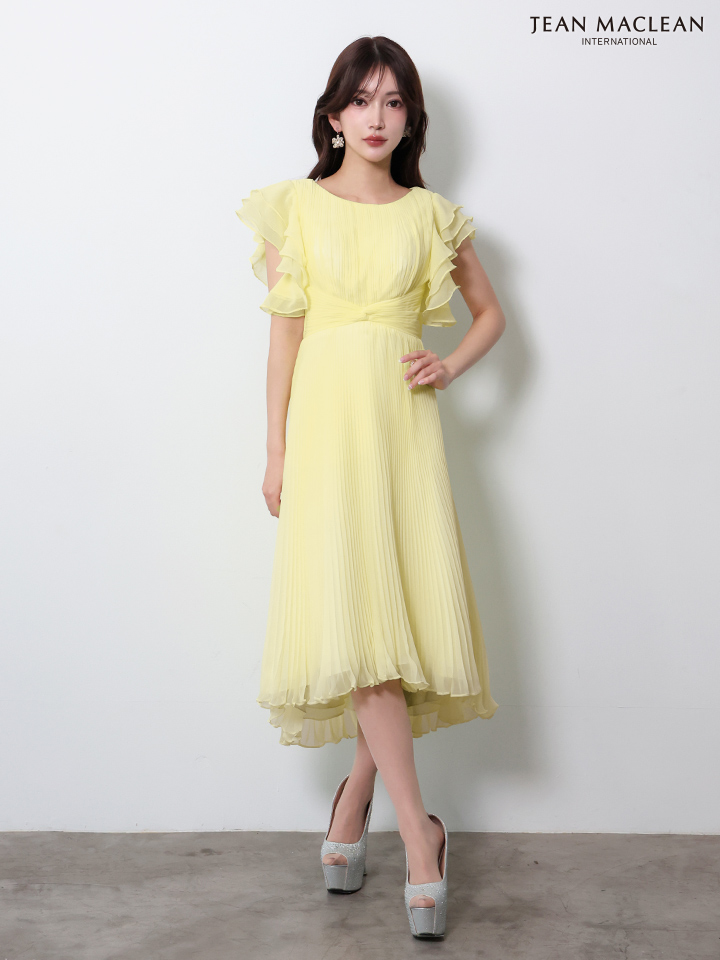 XSサイズあり【JEAN MACLEAN/ジャンマクレーン】シフォン/ ショルダーフリル/ フレンチスリーブ/ ウエストマーク/ プリーツ/ フレア/ ワンピース/ ミディアムドレス/ キャバドレス[OF2A] [61084-JM-W-2604]