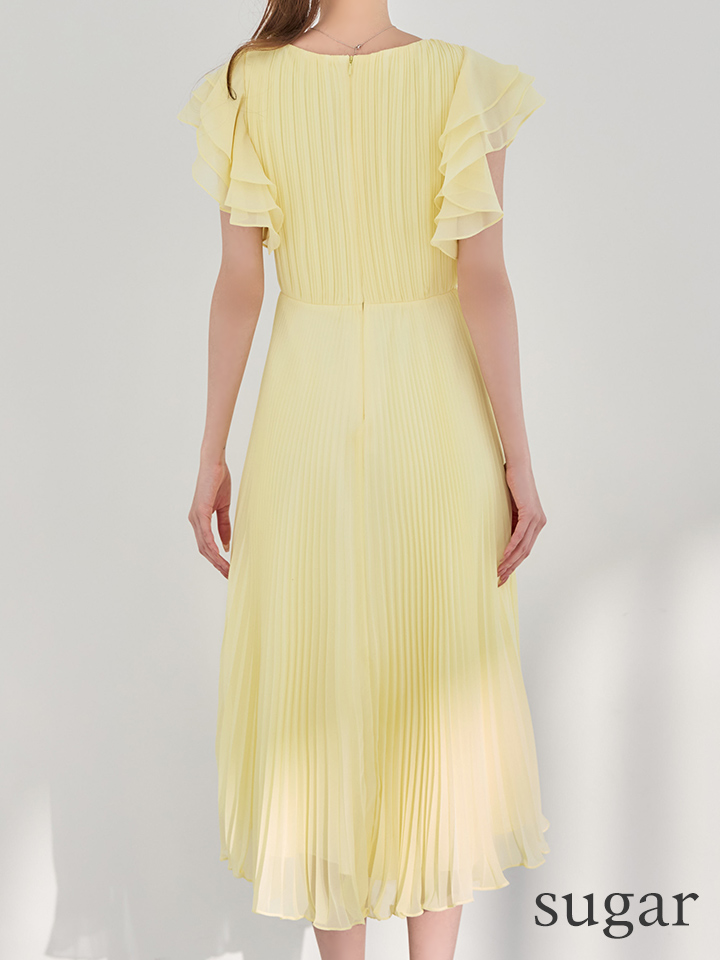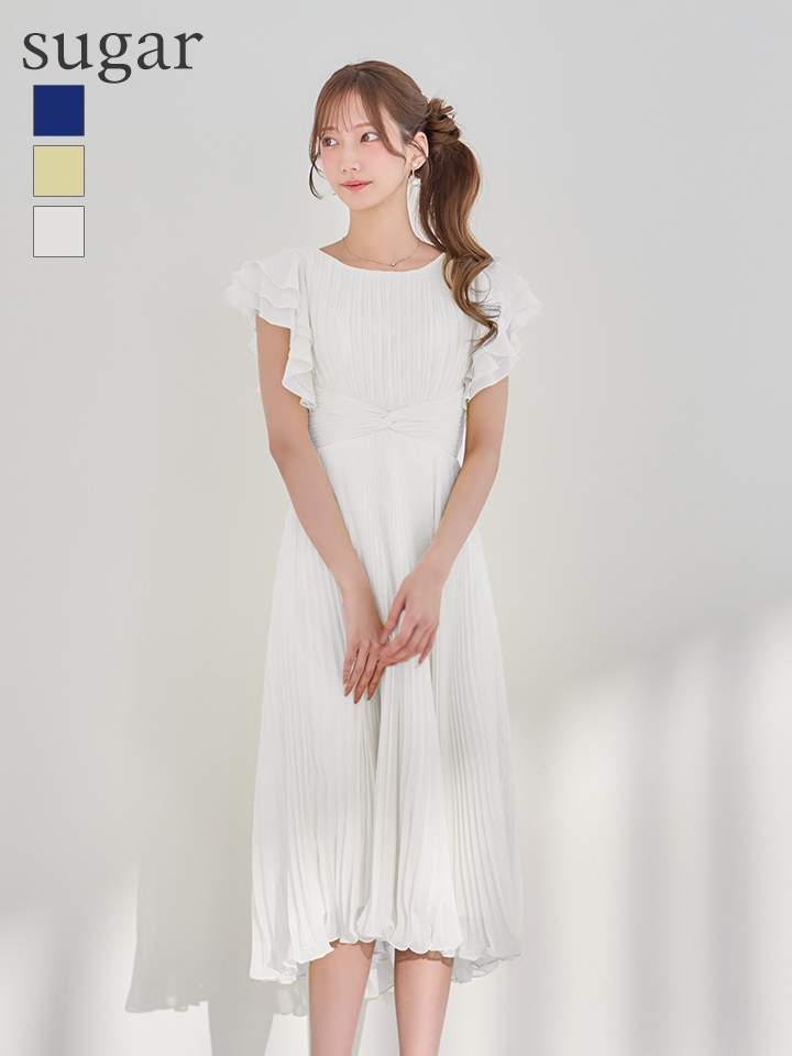 XSサイズあり【JEAN MACLEAN/ジャンマクレーン】シフォン/ ショルダーフリル/ フレンチスリーブ/ ウエストマーク/ プリーツ/ フレア/ ワンピース/ ミディアムドレス/ キャバドレス[OF2A] [61084-JM-W-S260418]