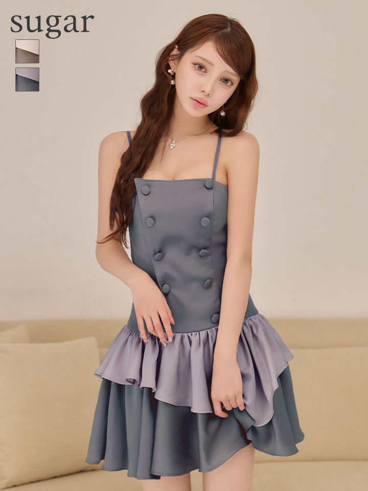 アシンメトリーに重ねたバイカラーのティアードフリルが可愛いフレアミニドレス♡