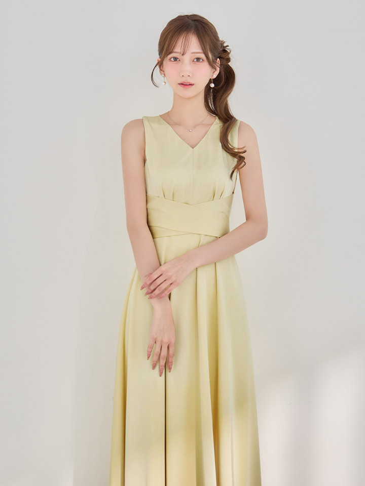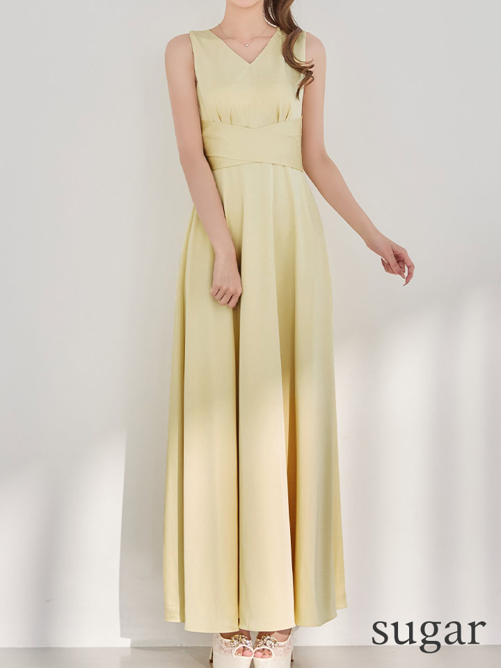 XS-Lサイズあり 【GINZA COUTURE/銀座クチュール】シンプル/ サテン/ Vネック/ ノースリーブ/ウエストマーク/ Aライン/ フレア/ ロングドレス/ キャバドレスlong[OF2] [LKC25182-Y-S260418]