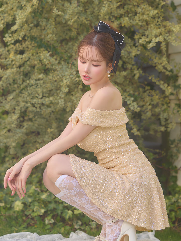 XSサイズあり【JOLIESSE/ジョリエス】刺繍/ スパンコール/ ラメ/ レース/ オフショル/ フレア/ ミニドレス/ キャバドレス[HC03] [OP-2604-BE-S260421]