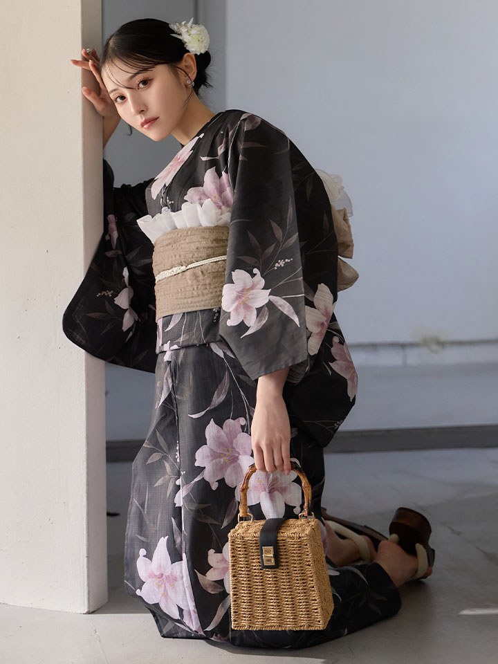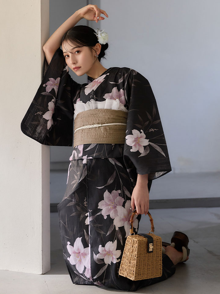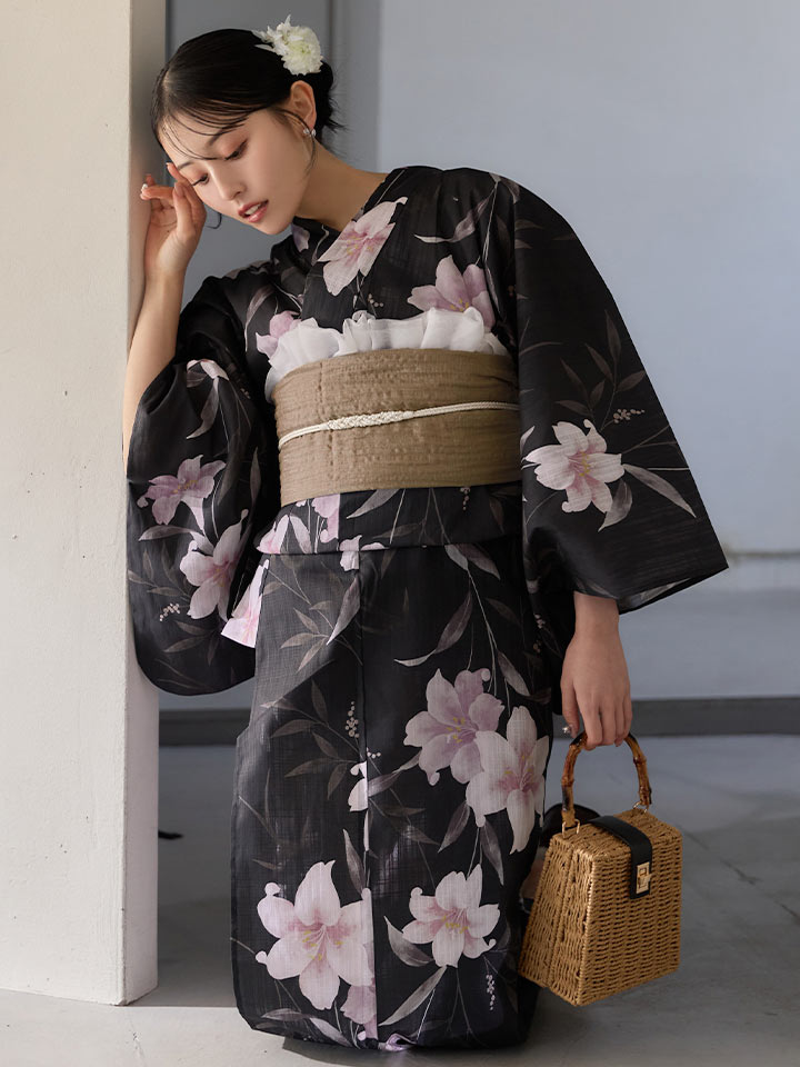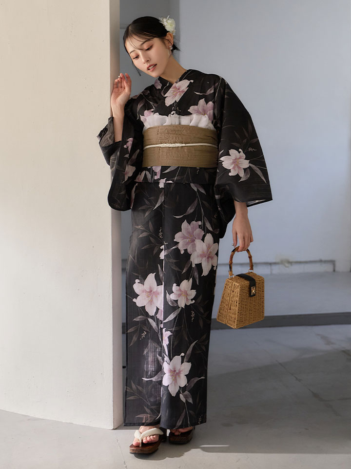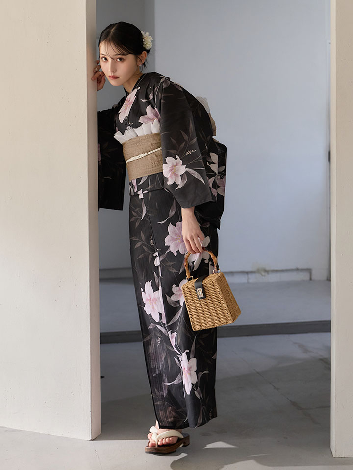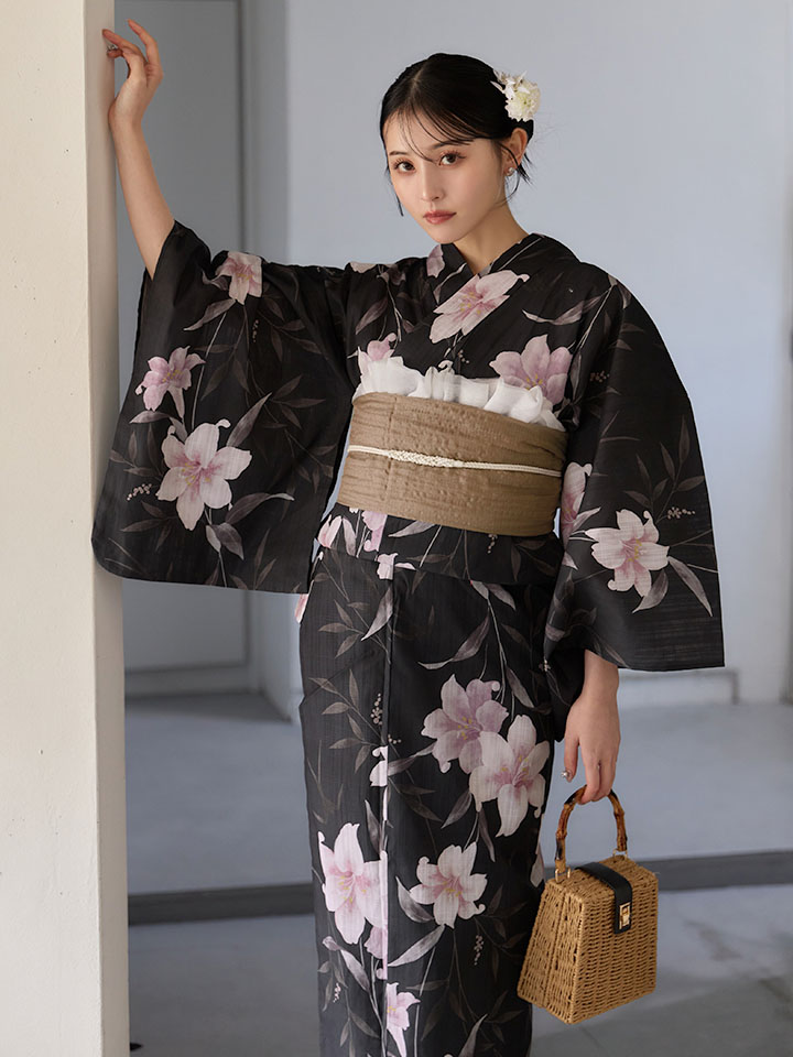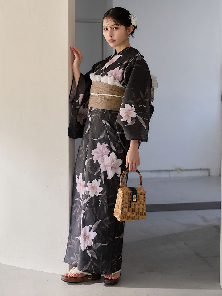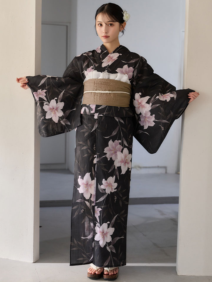 送料無料!ホワイトリリー黒地浴衣【浴衣3点セット 浴衣/帯/下駄】[OF04]【予約 / 6月中旬発送予定】