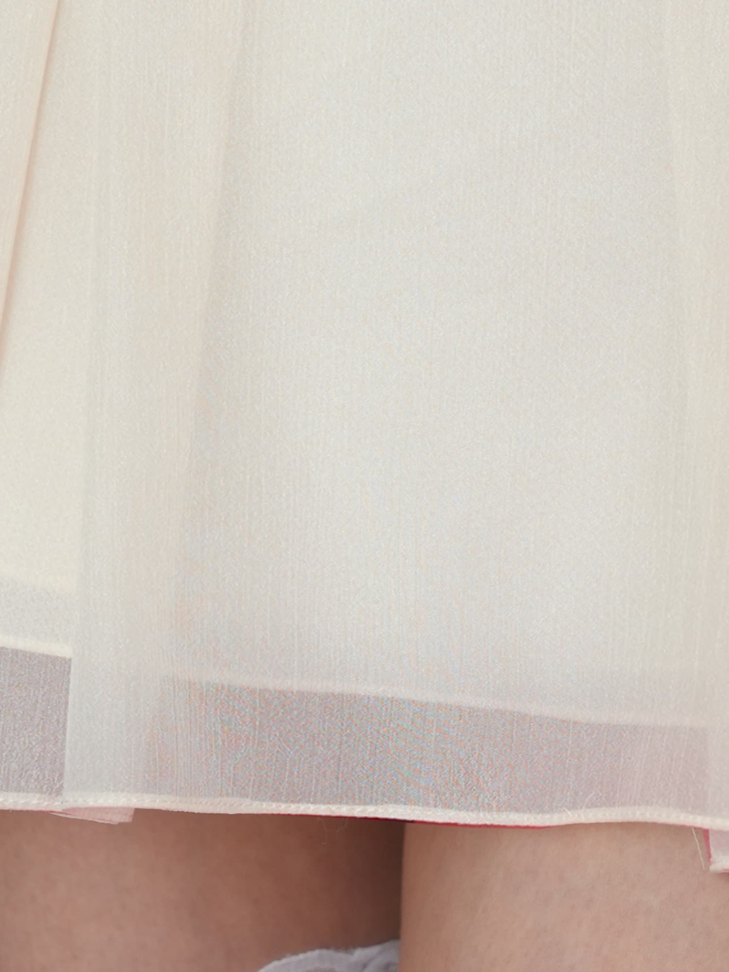 デコルテ部分のシアー切り替えと華奢なストラップが、上品な抜け感を演出します。