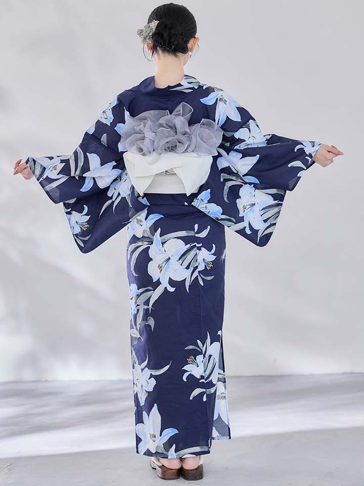 送料無料!ネイビーリリーフラワー浴衣【浴衣3点セット 浴衣/帯/下駄】[OF04]【予約 / 5月下旬発送予定】 [Y-9302-kj-NV-F-26MU-260422]
