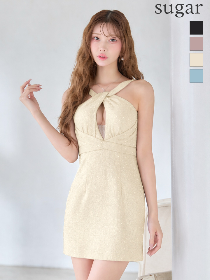 - > XSサイズあり【Glossy/グロッシー】クロスネックデザイン/ ストーン/ ラメニット/ タイト/ ミニドレス/ キャバドレス[OF08]