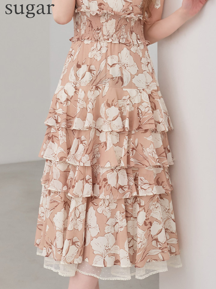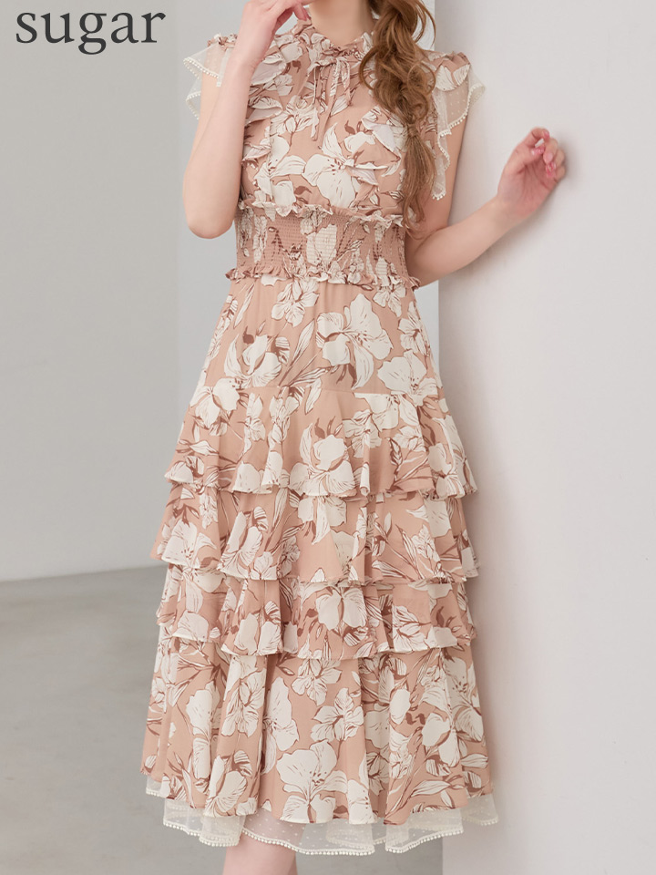 XS-Lサイズあり【SETTAN/セッタン】花柄/ シフォン/ フリルスリーブ/ プチハイネック/ ティアード/ Aライン/ ワンピース/ ミディアムドレス/ キャバドレス[OF2] [LKS161208-PxIV-S260424]