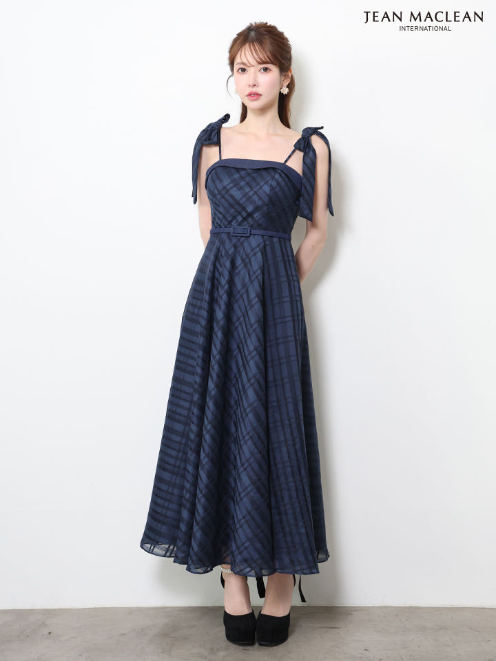 XSサイズあり【JEAN MACLEAN/ジャンマクレーン】オーガンジー/チェック/ ショルダーリボン/ ベルト/ キャミソール/ フレア/ ワンピース/ ミディアムドレス/ キャバドレス[OF2A] [61113-JM-SV-S260424]