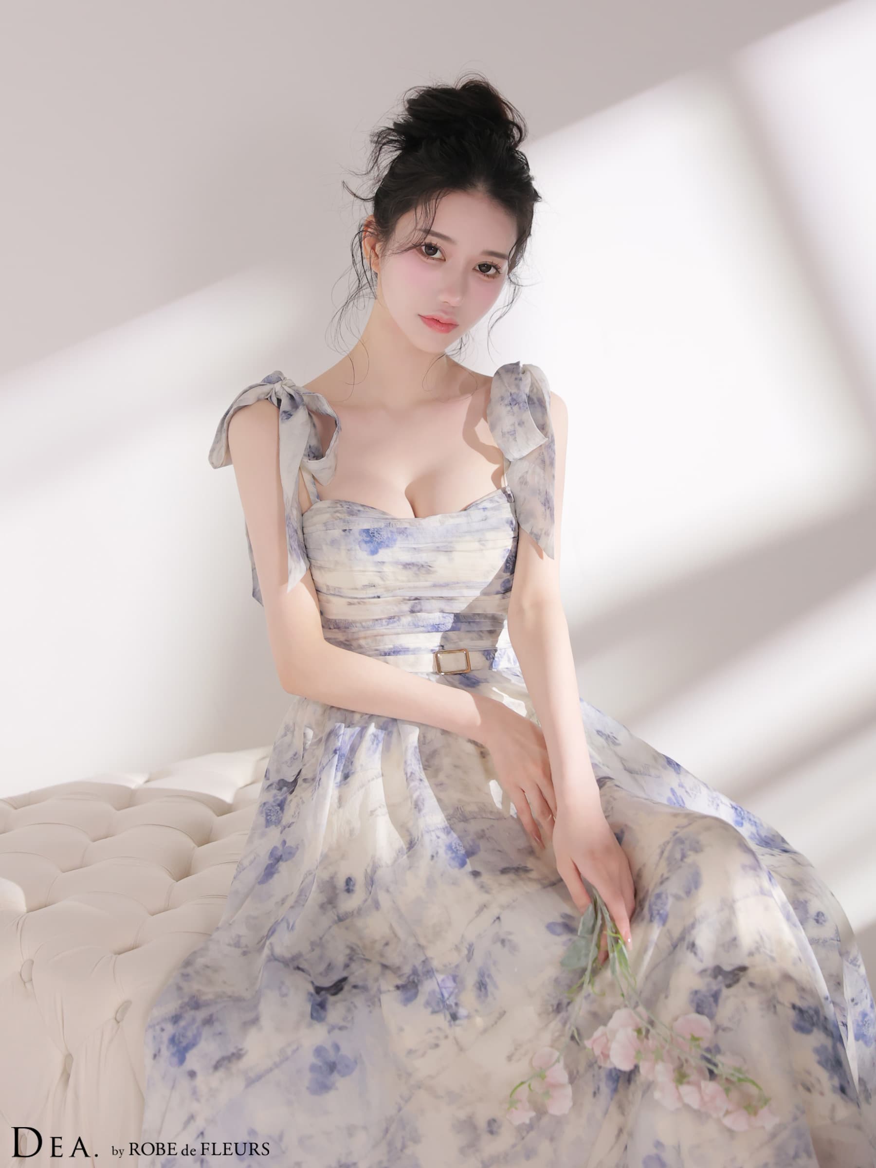 - > XSサイズあり【DEA./ディア】ブラーフローラル/ ギャザー/ リボン/ シフォン/ フレア/ ワンピース/ ミディアムドレス/ キャバドレス[OF08]