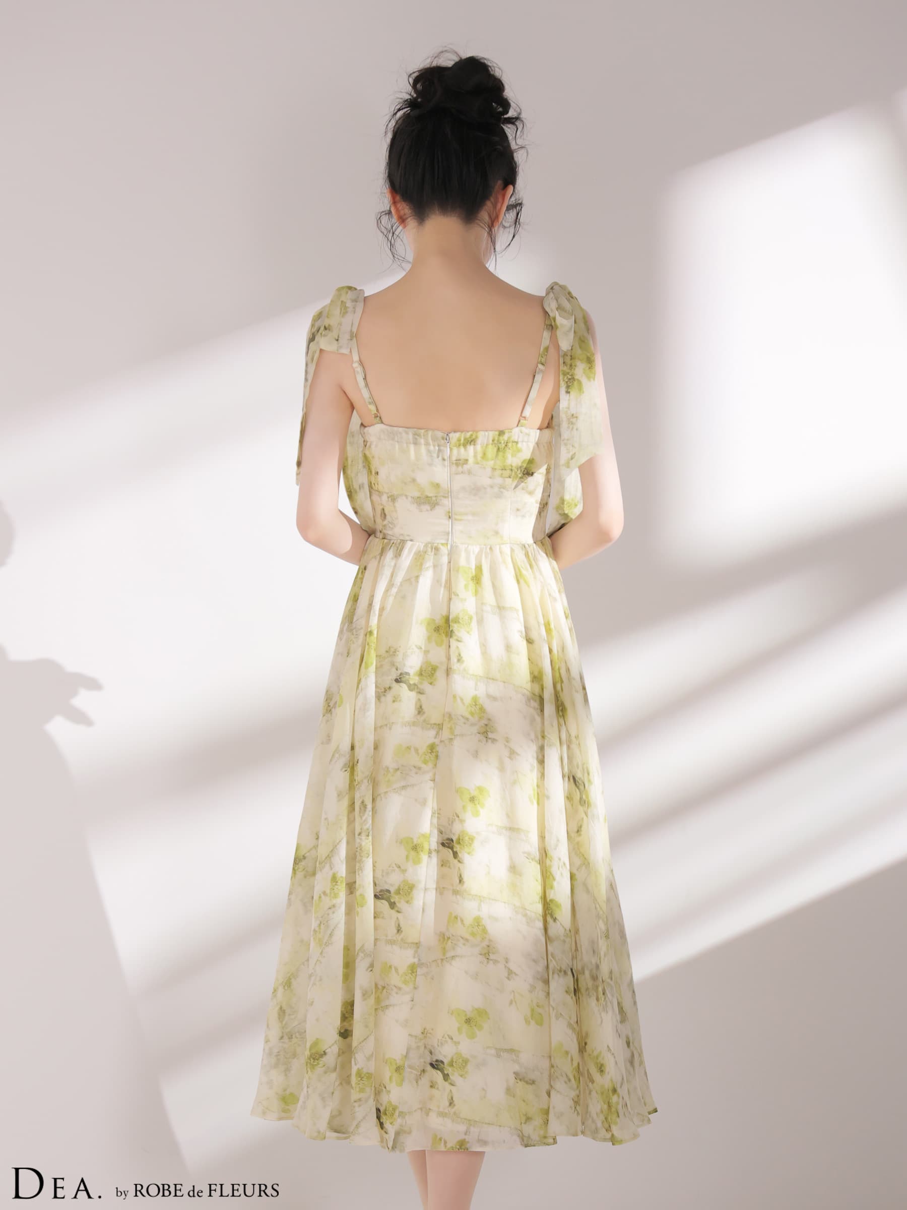 XSサイズあり【DEA./ディア】ブラーフローラル/ ギャザー/ リボン/ シフォン/ フレア/ ワンピース/ ミディアムドレス/ キャバドレス[OF08] [DE3499-GR-S260424]