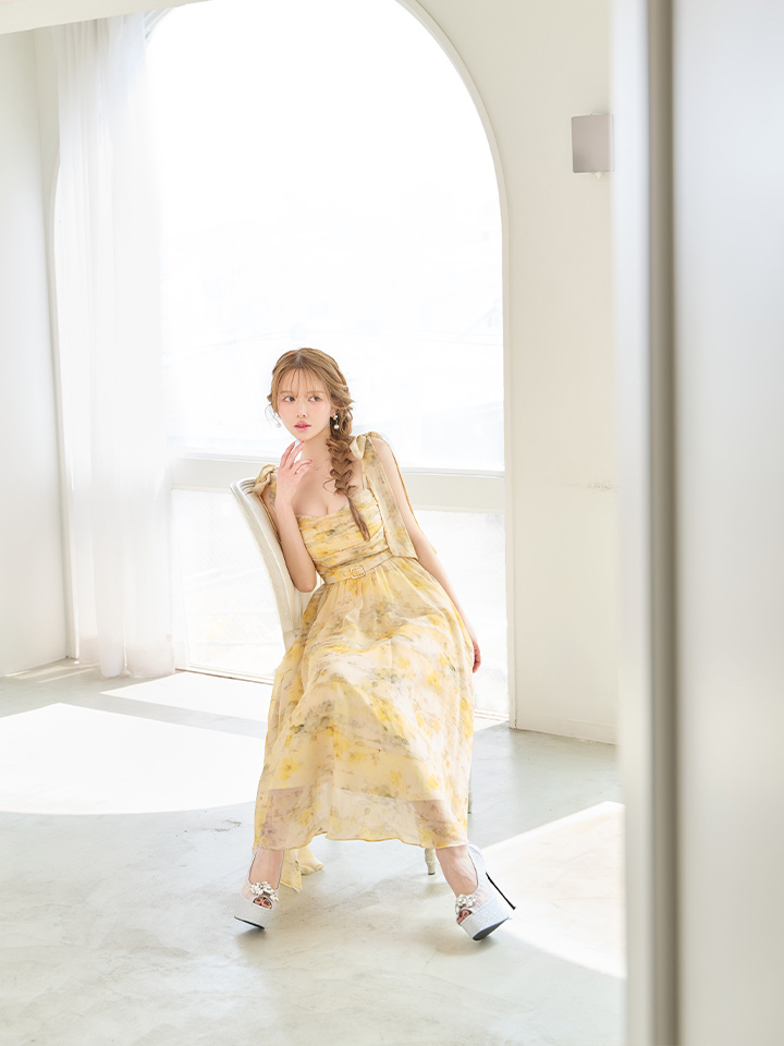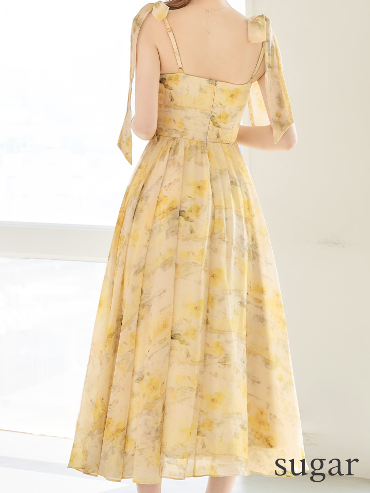 XSサイズあり【DEA./ディア】ブラーフローラル/ ギャザー/ リボン/ シフォン/ フレア/ ワンピース/ ミディアムドレス/ キャバドレス[OF08]